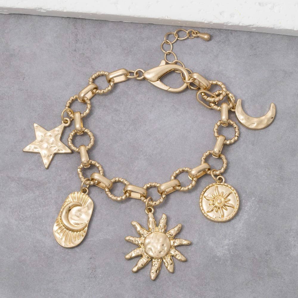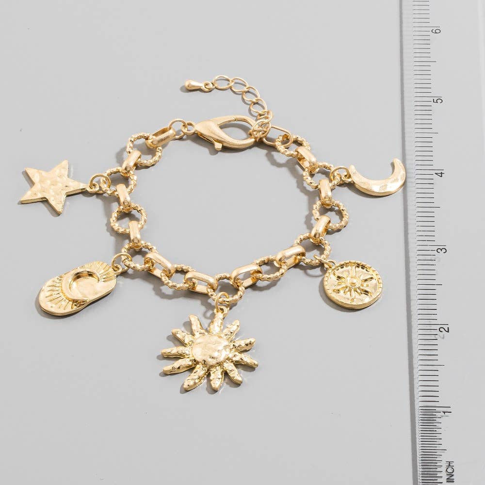 Unleash your inner fashionista, this chain bracelet embodies a sophisticated moon star sun charms design. A stylish chain bracelet that's perfect for complementing any outfit you wear.