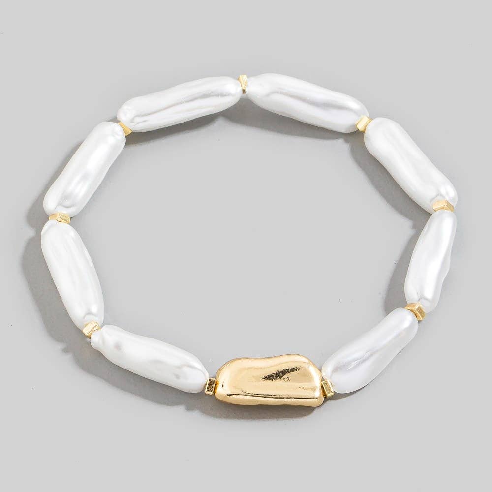A versatile piece that can be dressed up or down, this stretch bracelet boasts a magnificent long pearl design. Perfect for any occasion, this versatile stretch bracelet will enhance any outfit you wear.This stretch bracelet is made with 60% Alloy and 40% Pearl.