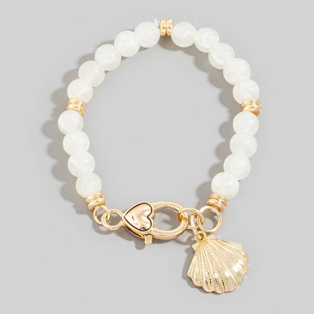 Make a statement, this bracelet incorporates a remarkable sea shell charm and heart clasp glass beaded design. Infuse elegance into your daily wardrobe with the versatile charm of this must-have bracelet. This bracelet is made with 85% Glass 10%Zinc Alloy 5%Plastic.
