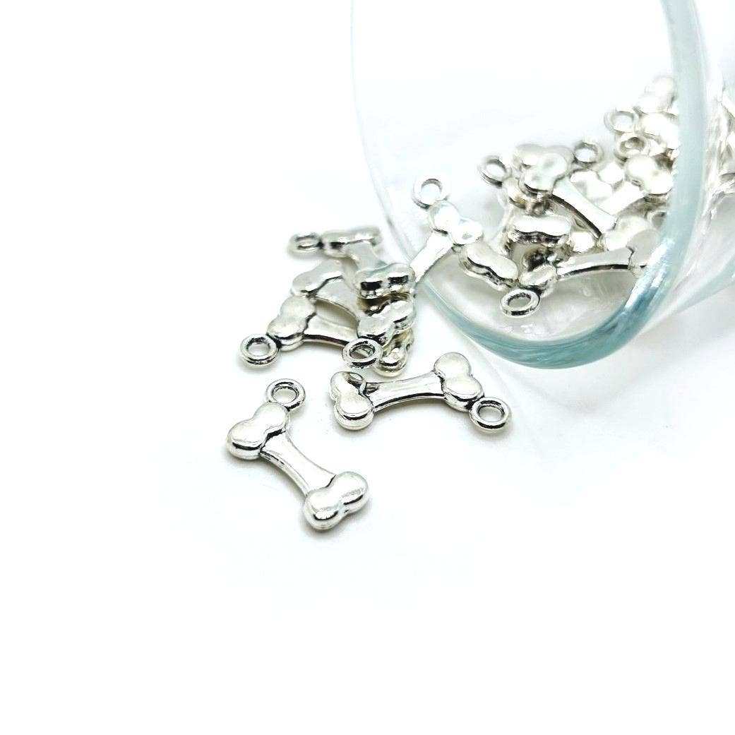 These silver-toned double-sided dog bone charms are a great way to personalize your craft projects. 11 x 16 mm -1.5 mm hole -Zinc Alloy