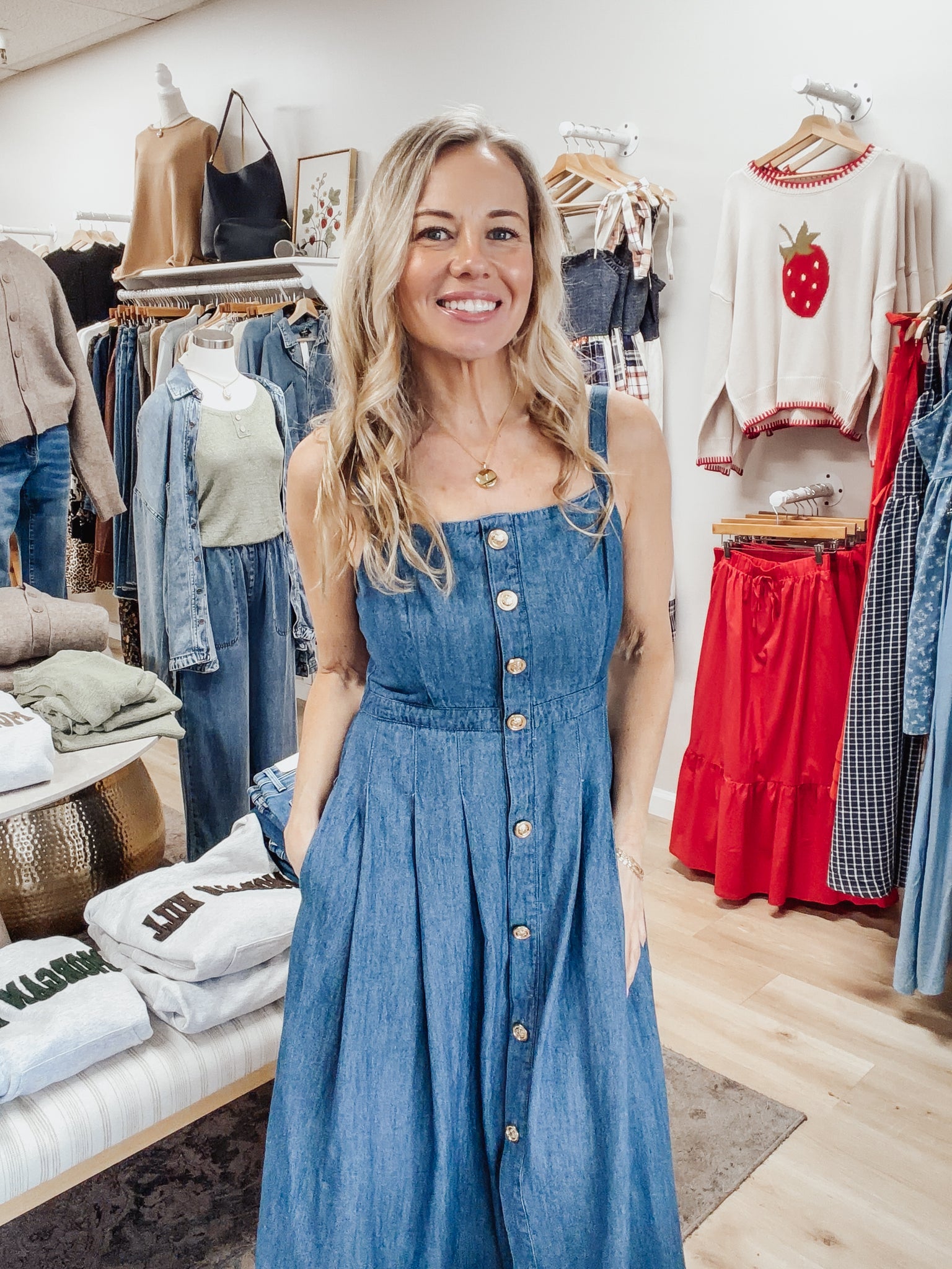 Designed with a flattering square neckline, adjustable straps, functional button front, and a comfortable smocked back, this dress fits beautifully while still feeling relaxed. The soft pleating through the skirt gives it movement, and yes — it has pockets.