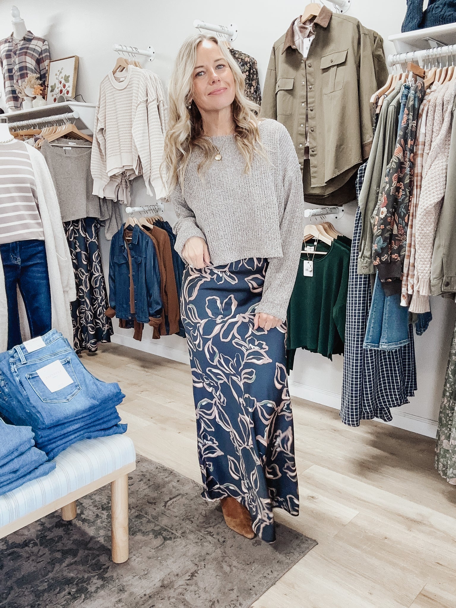 Effortlessly elegant, the Midnight Petal Maxi Dress features a deep navy satin-like fabric with soft blush floral outlines that give it a romantic, feminine feel. The adjustable straps and flattering scoop neckline create an easy, elongating silhouette, while the flowy skirt moves beautifully with every step. Dress it up with heels and jewelry for fall events, weddings, or date nights—or give it a cozy twist layered with a knit sweater and boots. Model is wearing a medium.