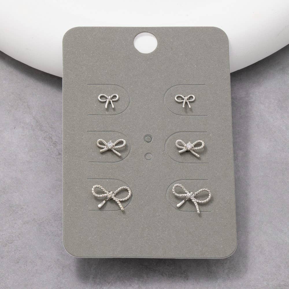 Add a touch of luxury to any outfit, this pair of stud earrings exudes a refined dainty bows set design. Redefine your wardrobe with this versatile pair of stud earrings, a timeless addition that brings an air of sophistication to any look.