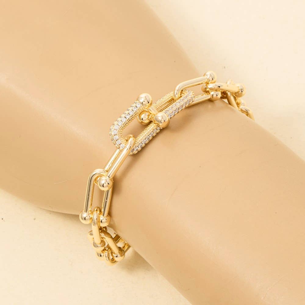 Add some edge to your wardrobe, this chain bracelet radiates a sleek gold dipped cubic zirconia pave u link design. Elevate your fashion statement with this versatile chain bracelet, adding a touch of glamour to your everyday look.  70% Zinc Alloy20% Brass 10% Cz.