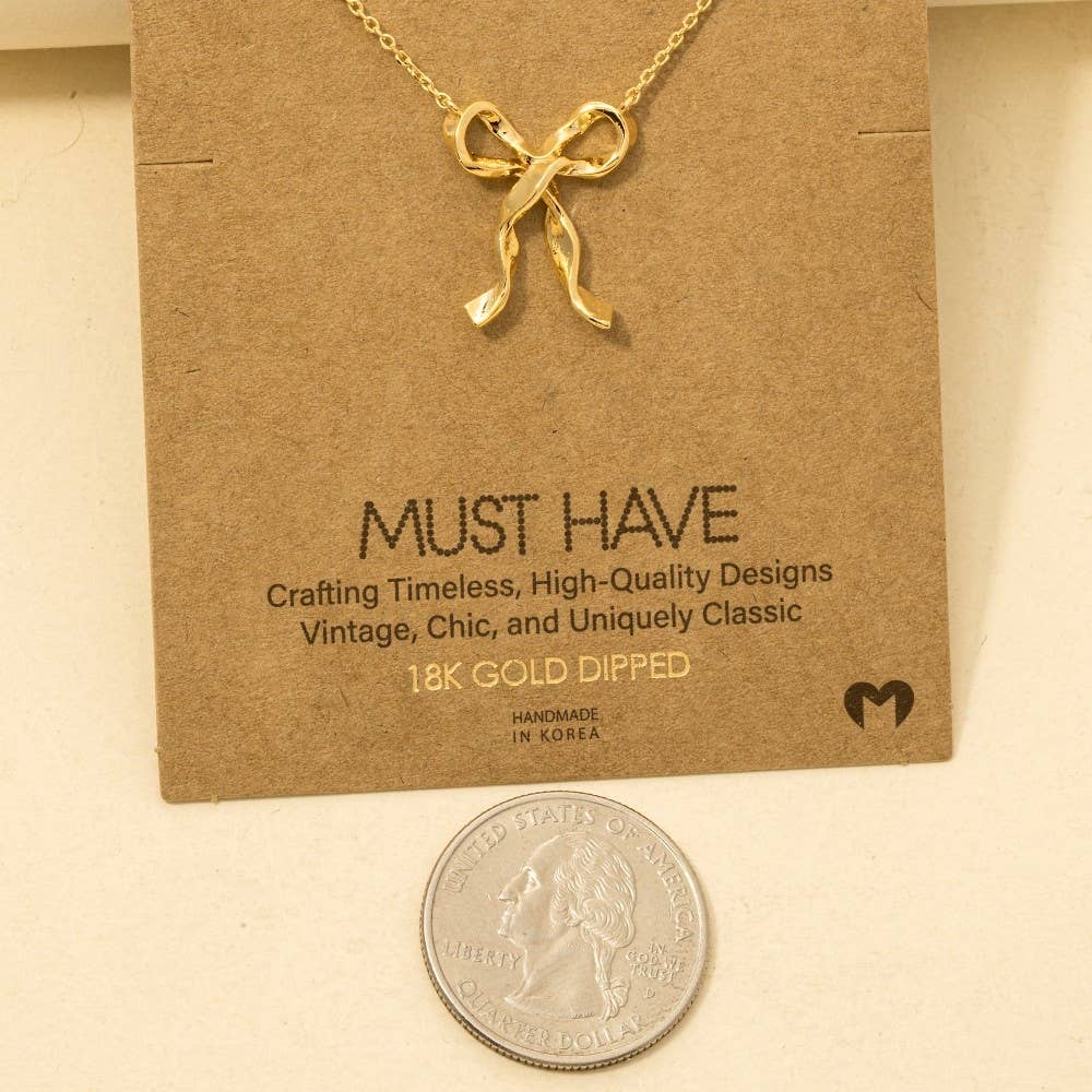 This piece is the perfect way to add some glamour to your look, this trending necklace offers a remarkable gold dipped long ribbon bow pendant necklace design. The perfect way to elevate any outfit, this trending necklace adds a touch of elegance and style.