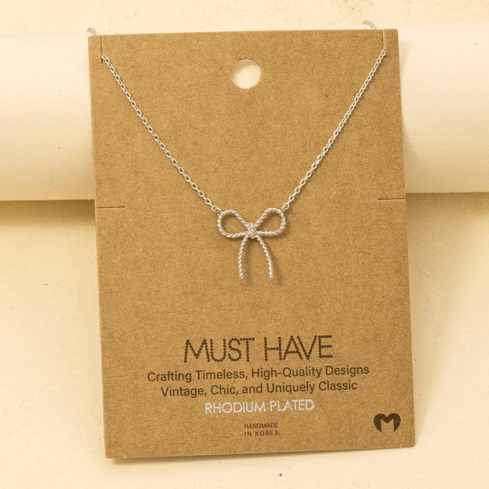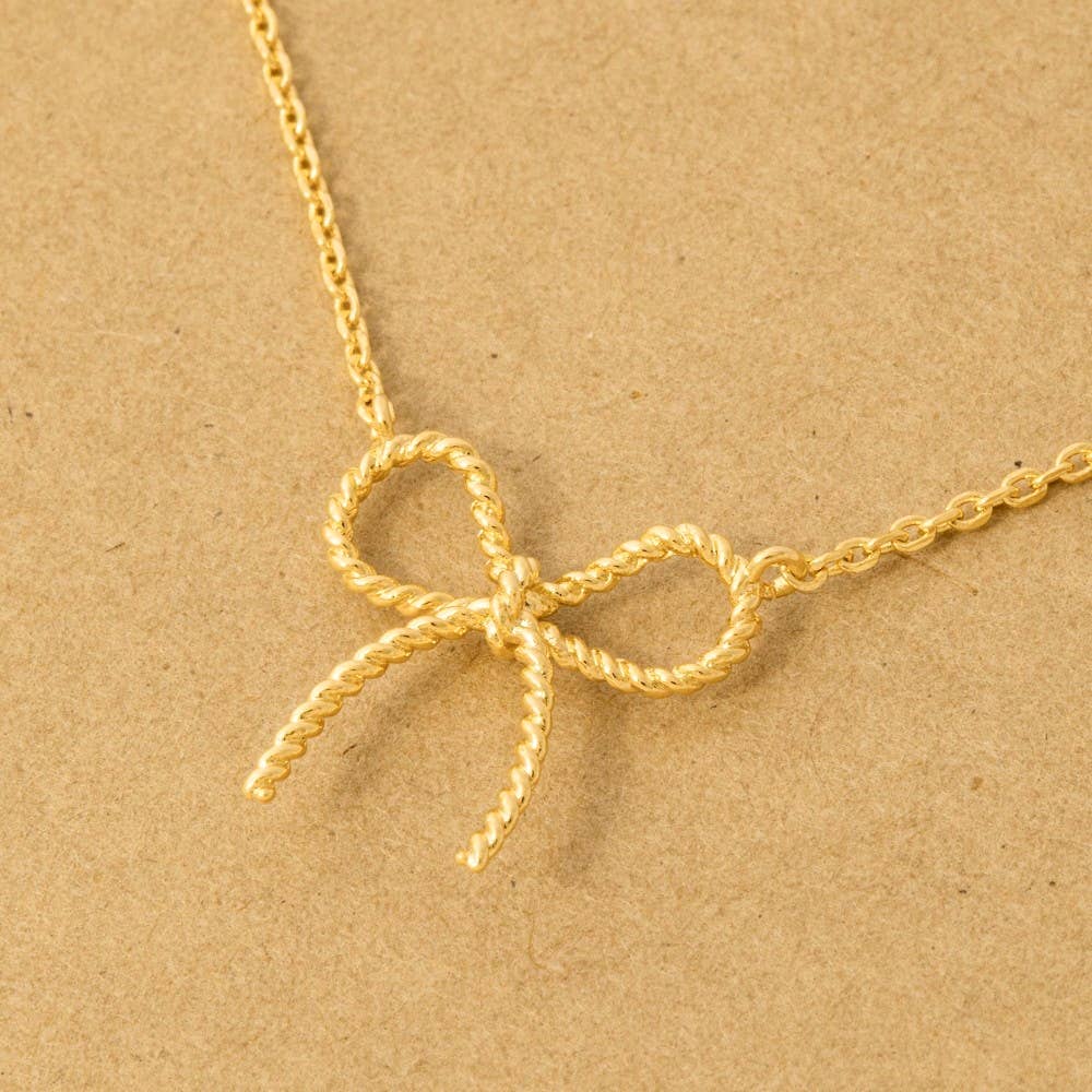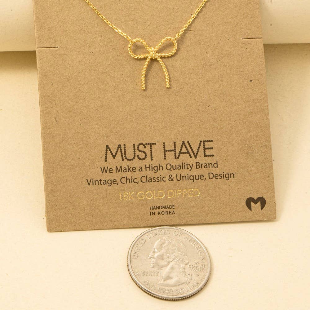 Perfectly versatile and endlessly stylish, this trending necklace showcases a breathtaking gold dipped textured ribbon bow pendant chain necklace design. This item adds the perfect finishing touch to any outfit, making it stand out from the crowd.