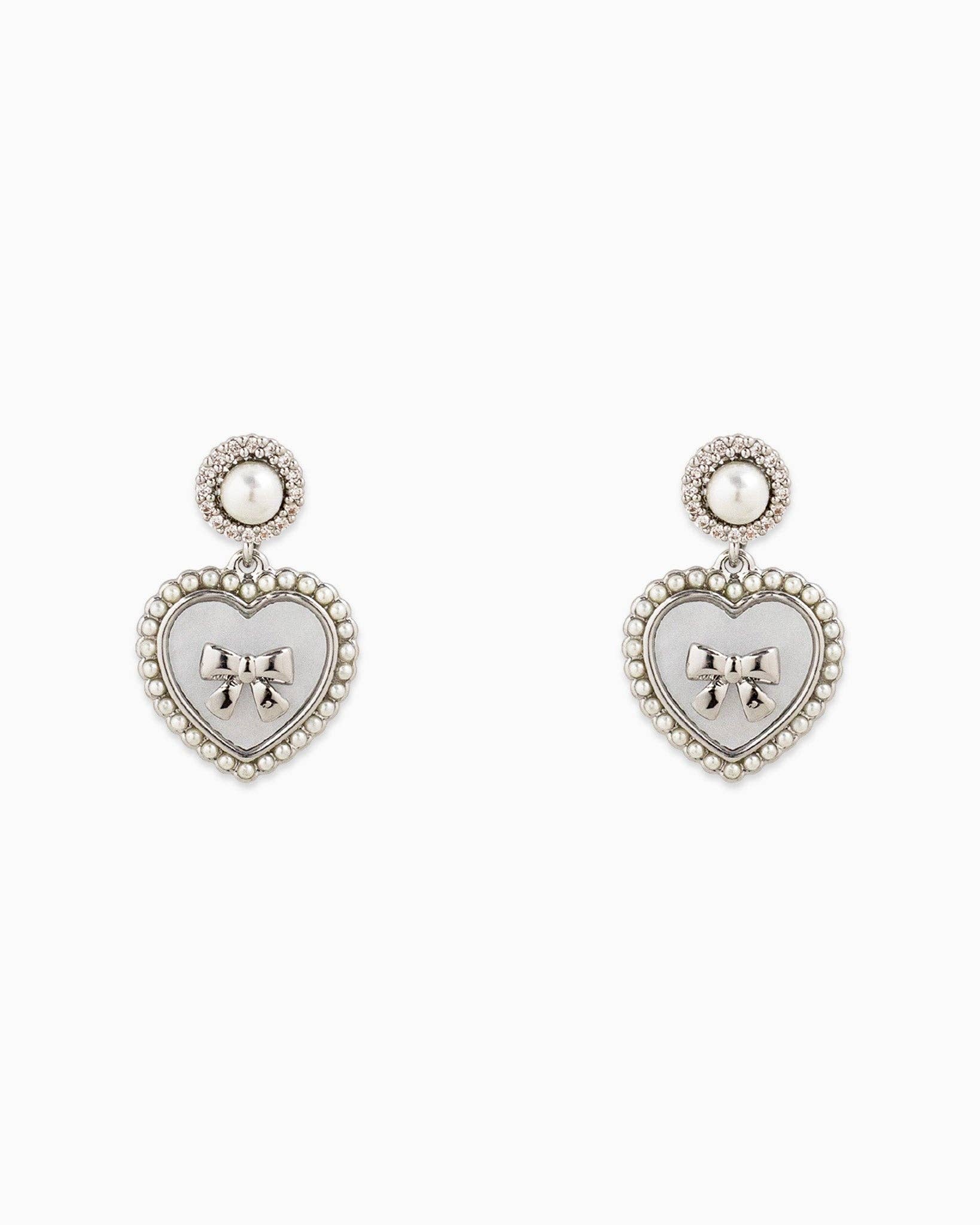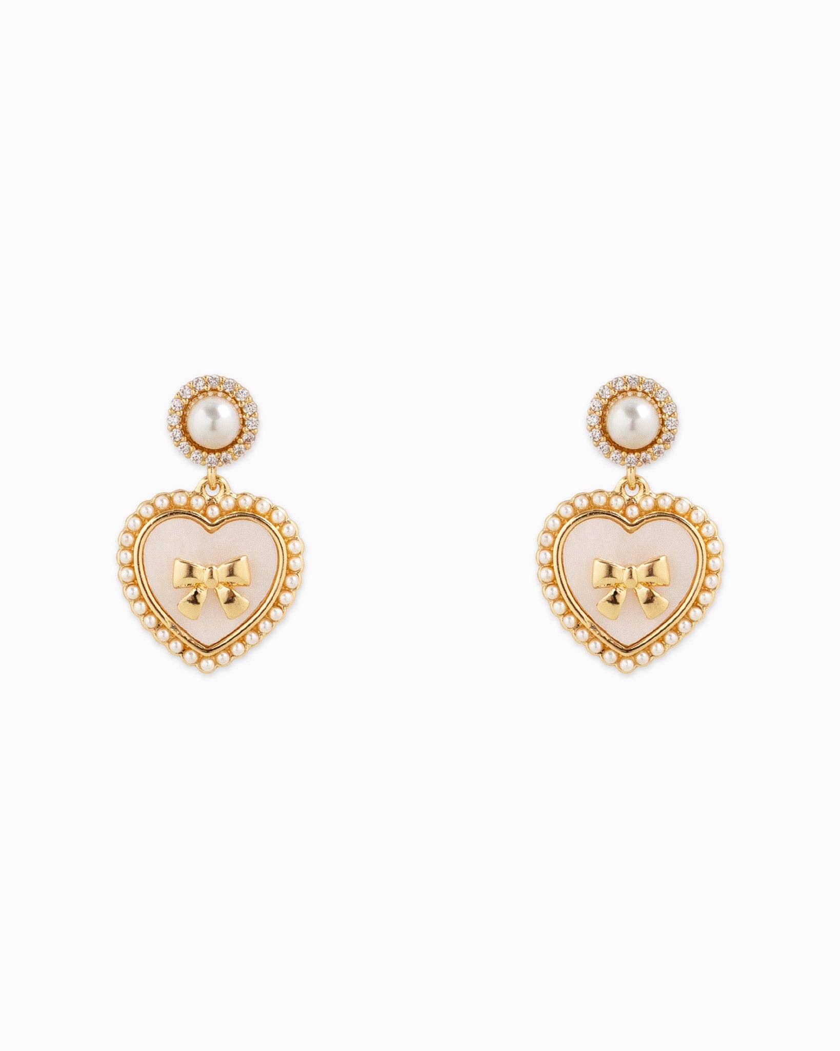 This gorgeous drop earrings features a stunning pearl stud with a croquette style heart drop with a bow ornament stamped. Sizes: 14*22mm, 14*15mm Heart, 1mm CZ Material: Brass, Acrylic, Acrylic Pearl, CZ