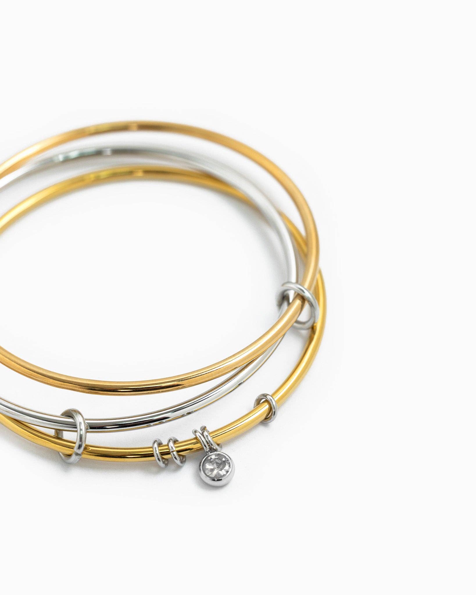 A sculptural triple-bangle design crafted as one interlocked piece, featuring three polished rings seamlessly linked together. Material: STAINLESS STEEL,CZ Size: 60MM