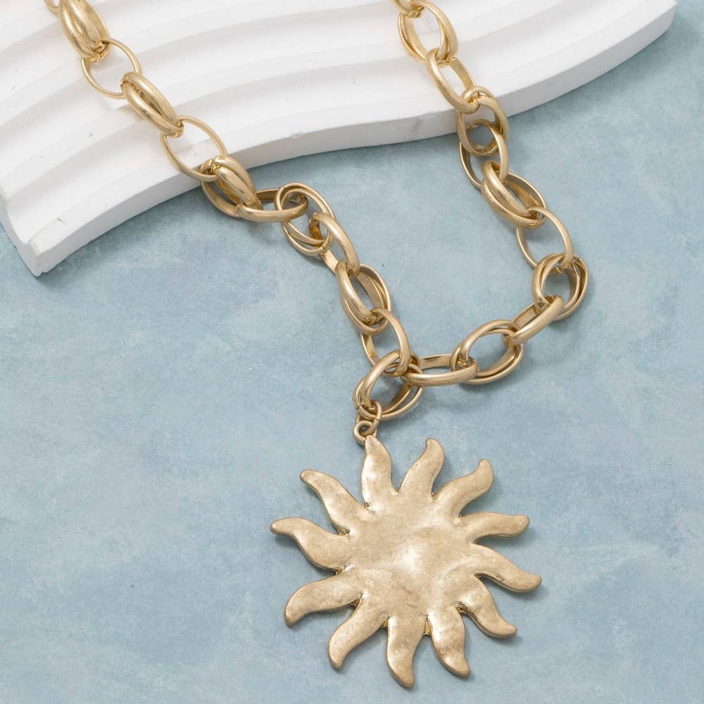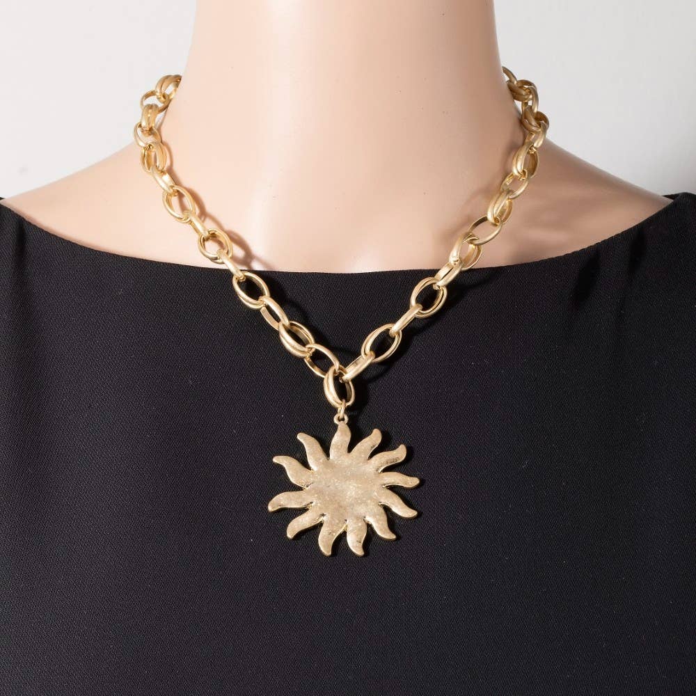 A stunning piece that is sure to turn heads, this chain necklace incorporates a flawless weathered metallic sun pendant design. Perfect for adding a touch of glamour and sophistication to any outfit, this chain necklace is a must-have.