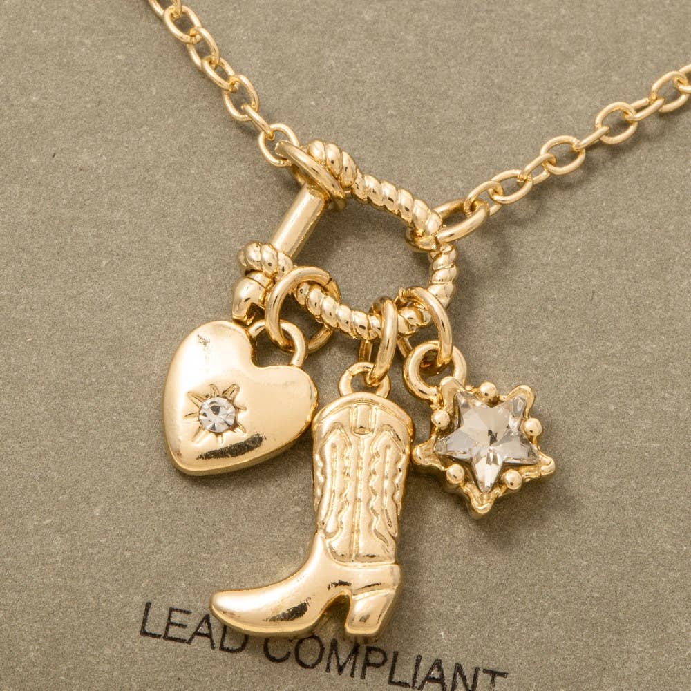 Add a touch of elegance and glamour to your look, this chain necklace offers a remarkable western cowboy boot and heart charms design. This chain necklace is ideal for both casual and formal events, adding a touch of sophistication to any outfit.