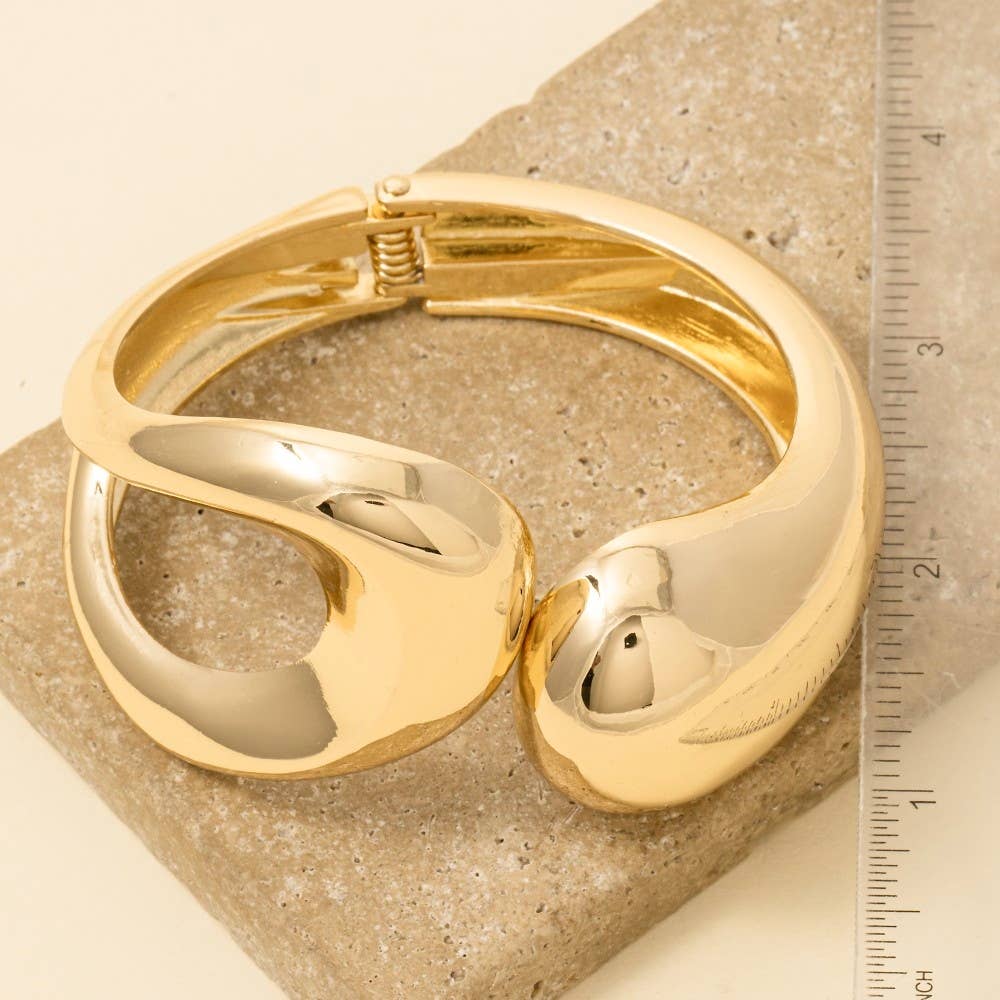Make a bold statement, this bangle bracelet shows off a distinctive abstract metal statement design. Infuse your ensemble with a touch of sophistication using this versatile bangle bracelet, a game-changer in the world of fashion.