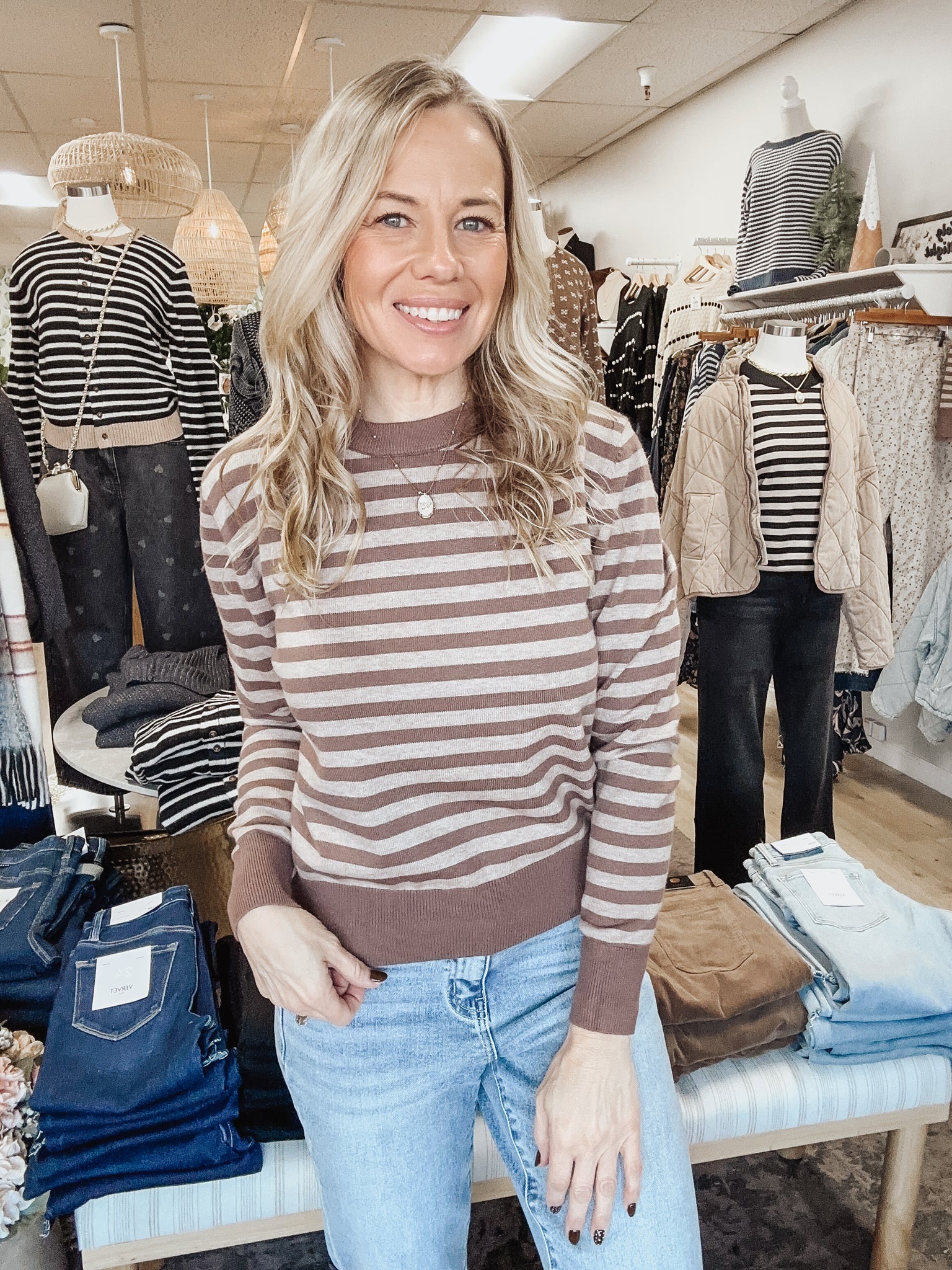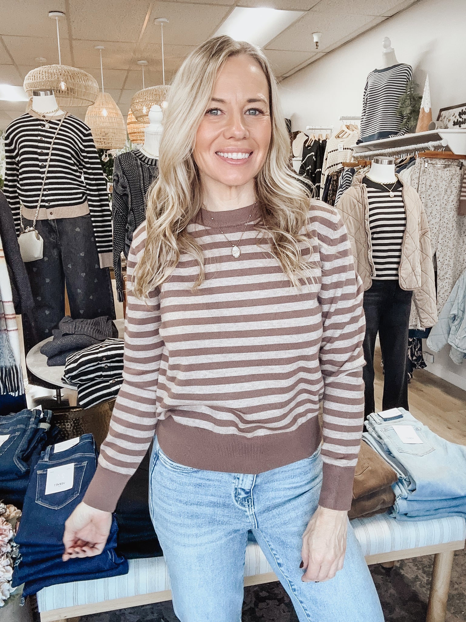 Classic Lines Striped Crew Neck Sweater - Brown