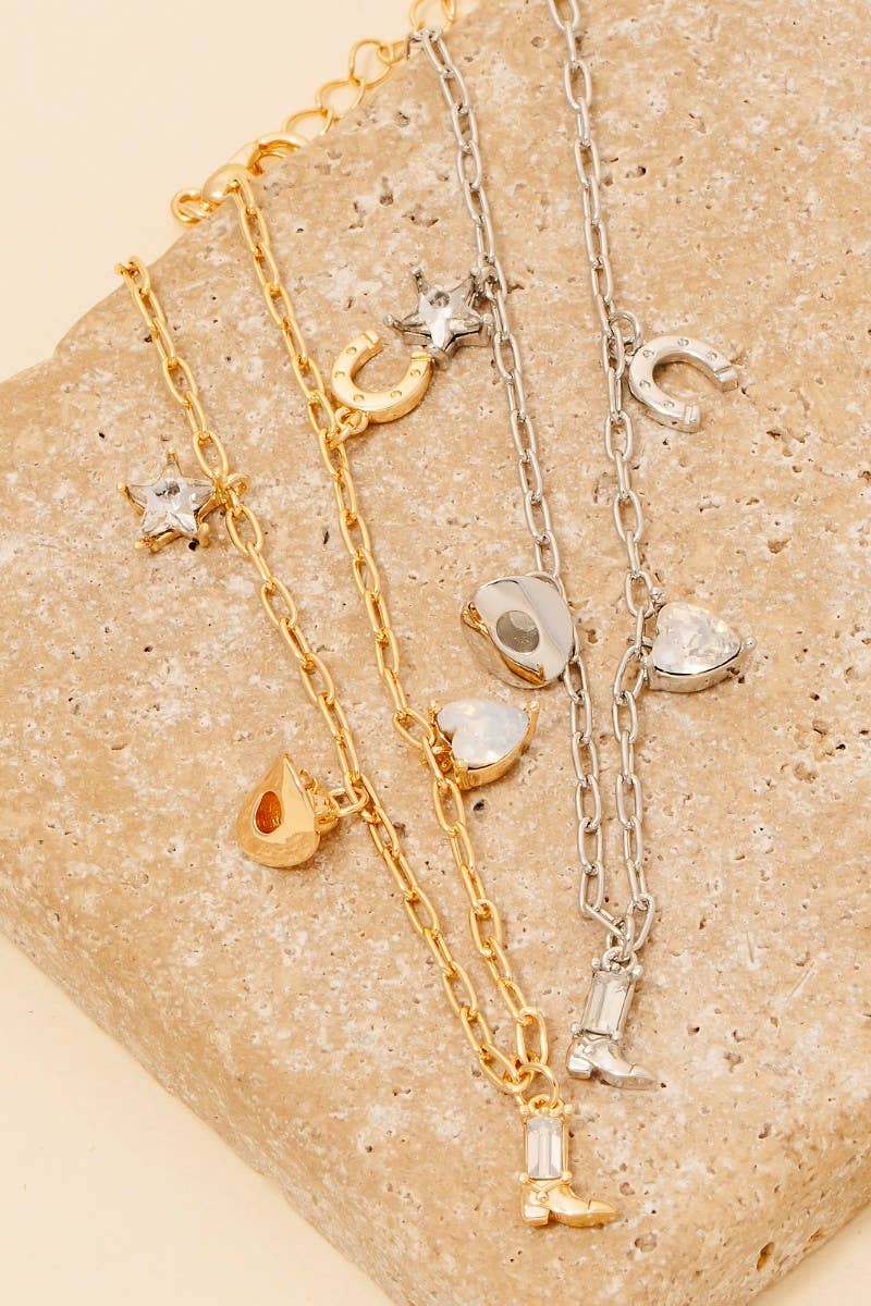 A versatile piece that can be dressed up or down, this chain bracelet shows off a distinctive cz studded mini western charms design. A must-have chain bracelet for anyone who loves to add some flair to their outfits.