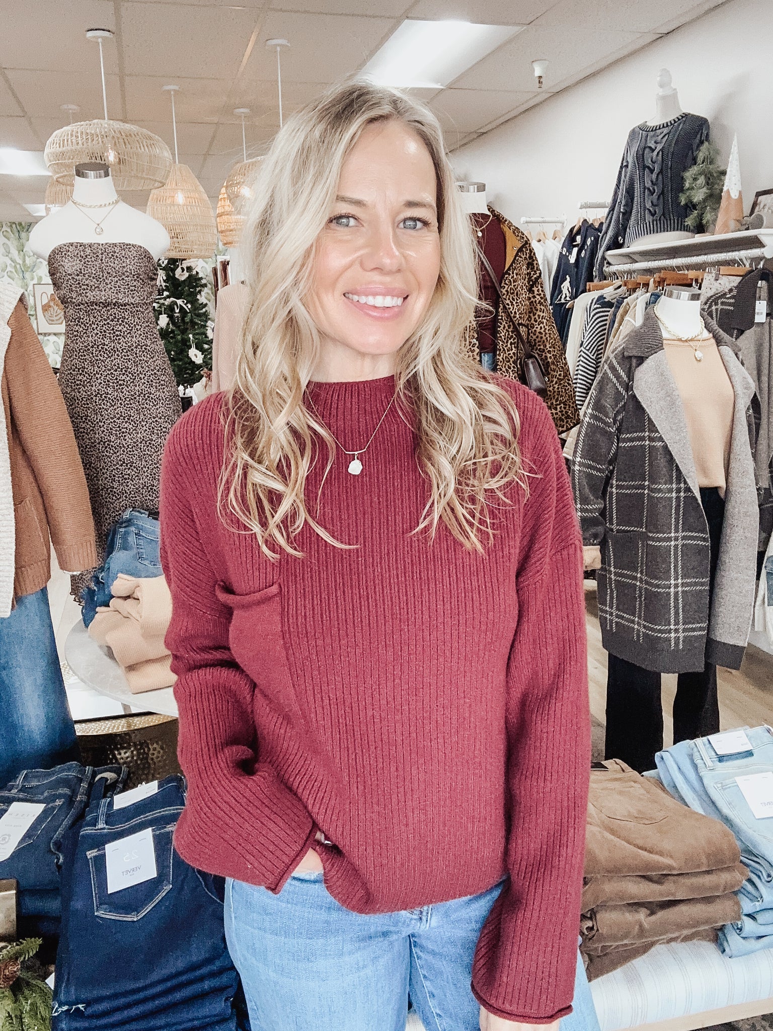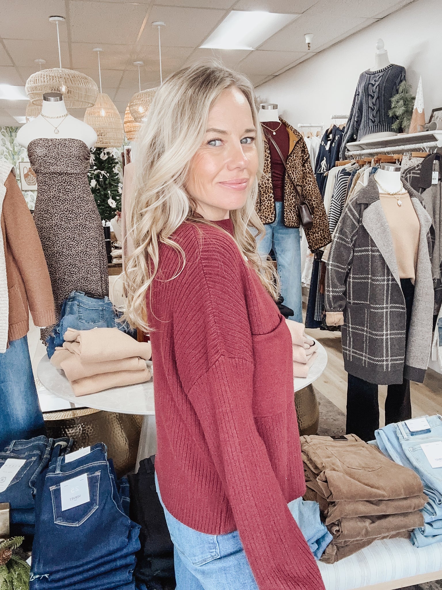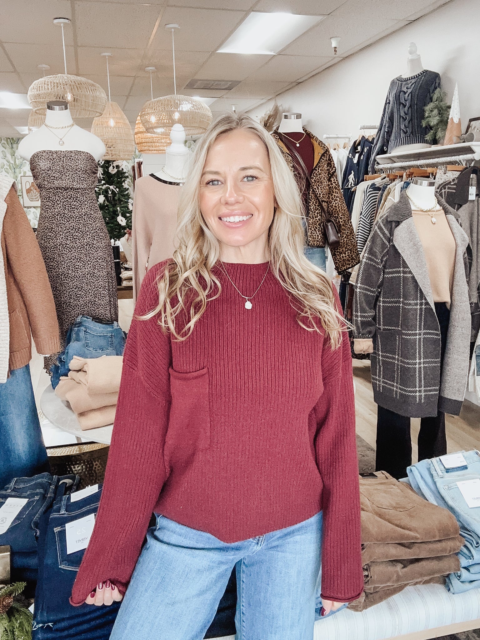 The Parker Pocket Sweater is the perfect blend of cozy and chic. Designed with a ribbed knit texture, relaxed fit, and a playful front patch pocket, it’s that easy everyday sweater you’ll reach for on repeat. Style it with denim for a casual weekend look, or dress it up layered over a collared shirt with boots. The model is wearing a medium.