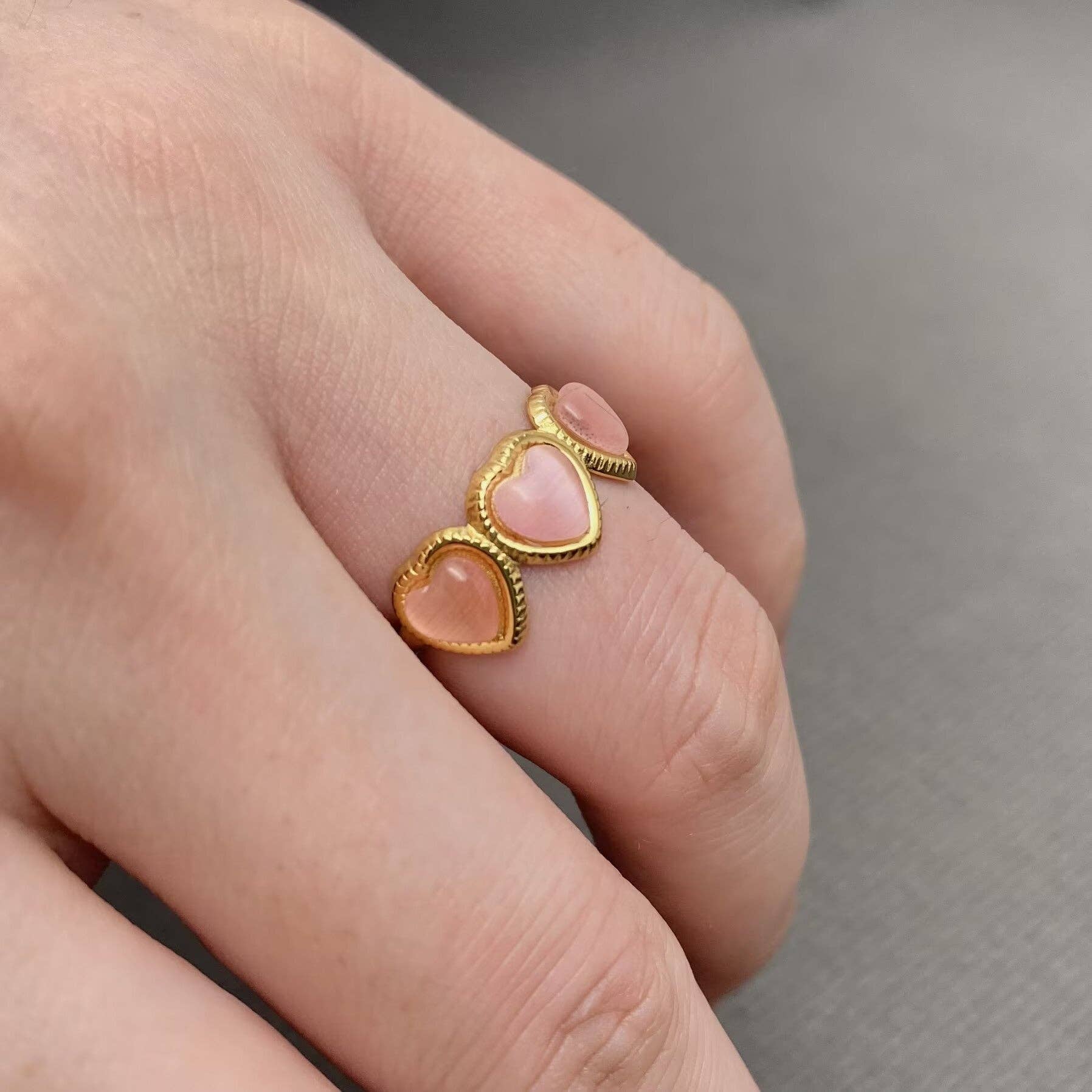 Purr-fect your style with this charming pink heart cat's eye stone ring! Crafted from premium stainless steel and finished with luxe 18K gold plating, this beauty combines durability with elegance. The mesmerizing cat's eye stone catches the light beautifully, while the high-polish surface gleams with sophistication. Created through precision vacuum electroplating and expert hand polishing, it's built to stay tarnish-free and stunning. Lead-free and body-safe, this ring makes an absolutely paw-some gift for yourself or someone special. Available in size 7#.