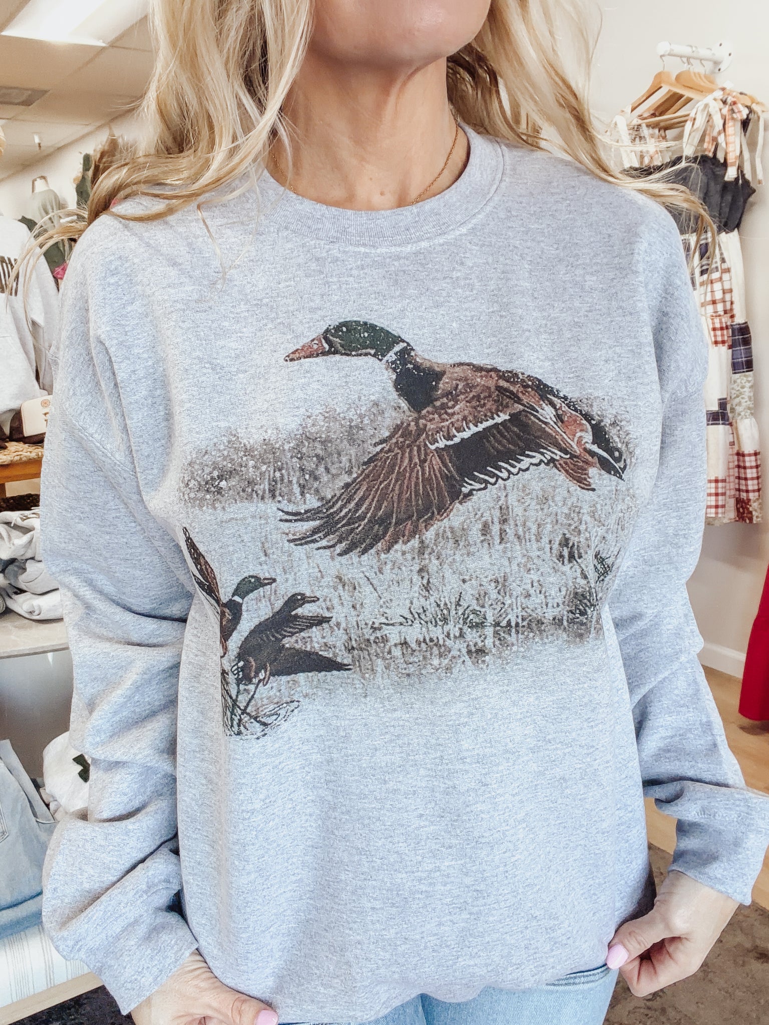The Wingspan Vintage Graphic Sweatshirt features a soft heather gray base with a classic flying-duck graphic across the front for a subtle outdoorsy, heritage feel. Designed with a relaxed fit and cozy fleece interior, this one is perfect for everyday wear—easy to style with denim, trousers, or layered over a collared shirt.