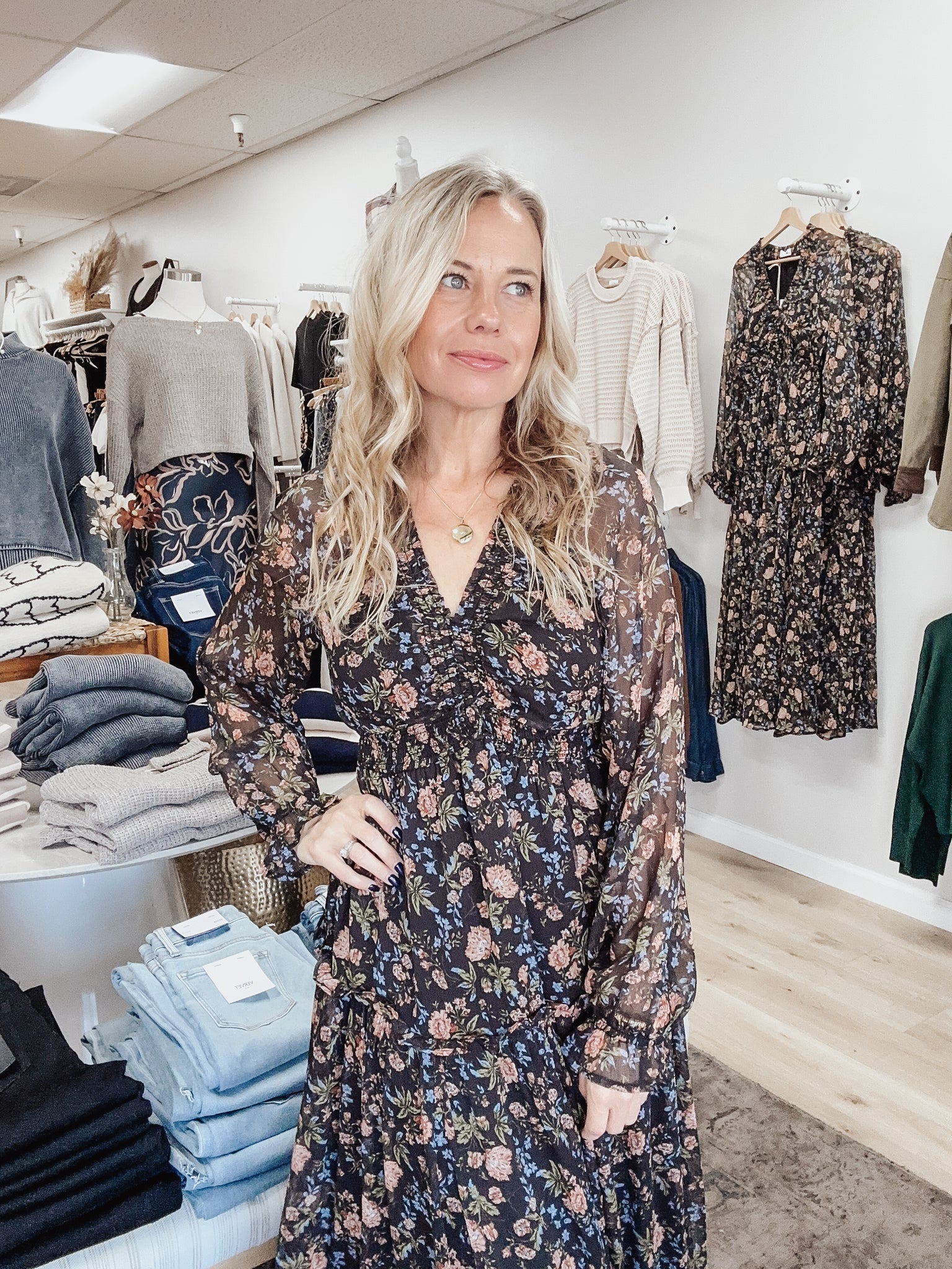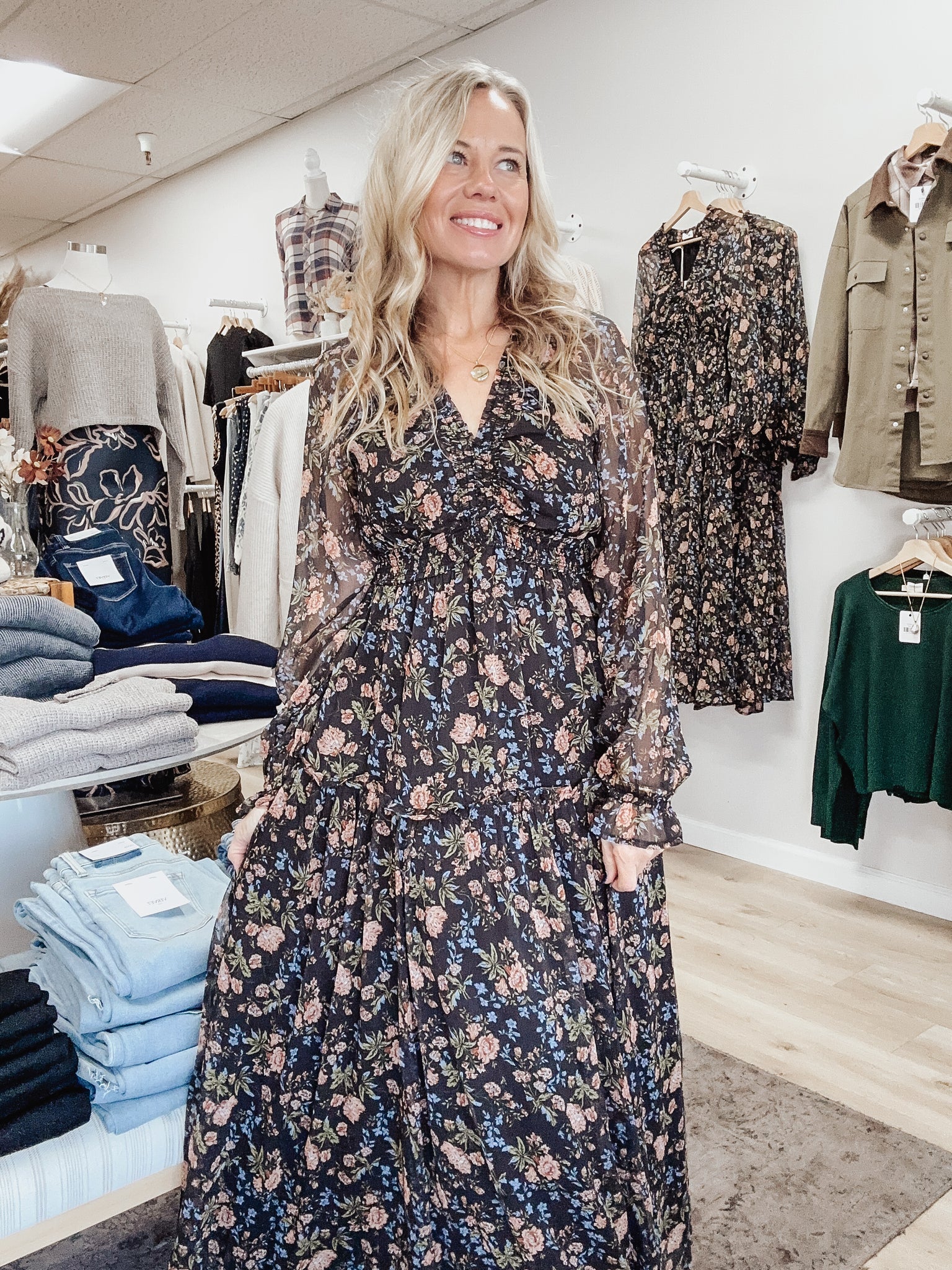 Step into timeless elegance with the Rosewood Garden Maxi (has pockets!!). This flowy dress features a romantic floral print in moody black and denim blue tones. The smocked bust and flattering V-neckline create a feminine silhouette, while the sheer long sleeves add an airy, graceful touch. Tiered layers give the skirt effortless movement, making it ideal for twirling into fall gatherings or weekend brunch. Pair with boots and a leather satchel for a cozy autumn look, or elevate it with heels and dainty gold jewelry for evening plans. Model is wearing a medium.