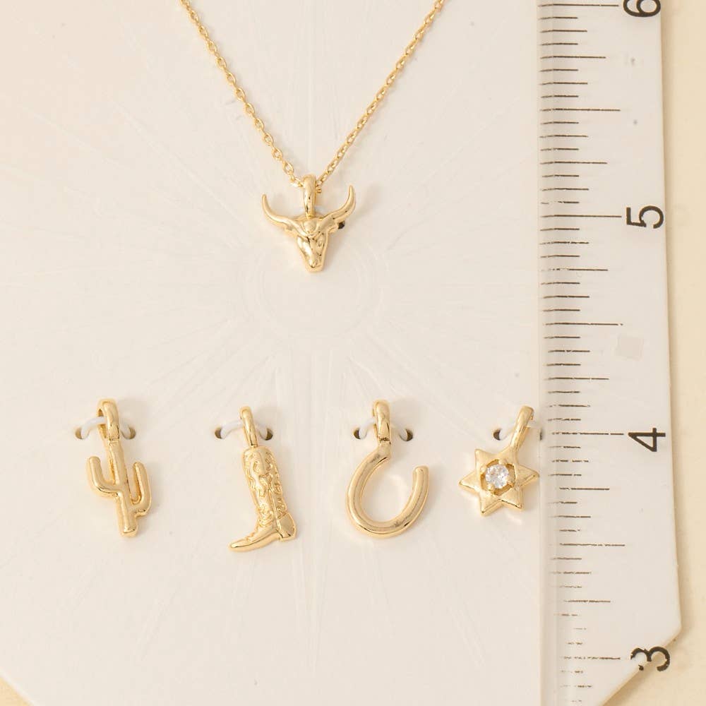 Comes With Cactus, Cowboy Boots, Horse Shoe And Star Swappable Pendants. This necklace is made with 25%Zinc 50% Brass 25% Cz.