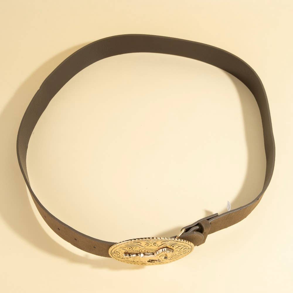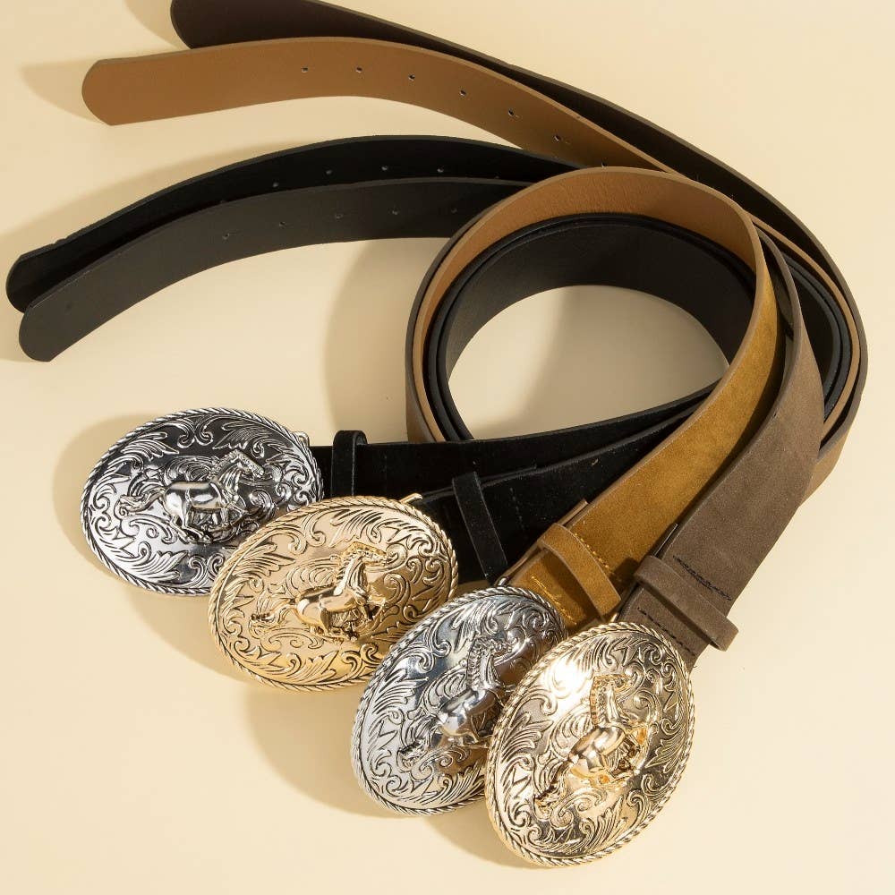 Effortlessly chic and sophisticated, this belt embodies a sophisticated western large engraved horse buckle design. This belt is an effortless way to add some personality to your outfit. Available in GBK, GDBR, SBK, SLBR. This item is sold in packs of 1.