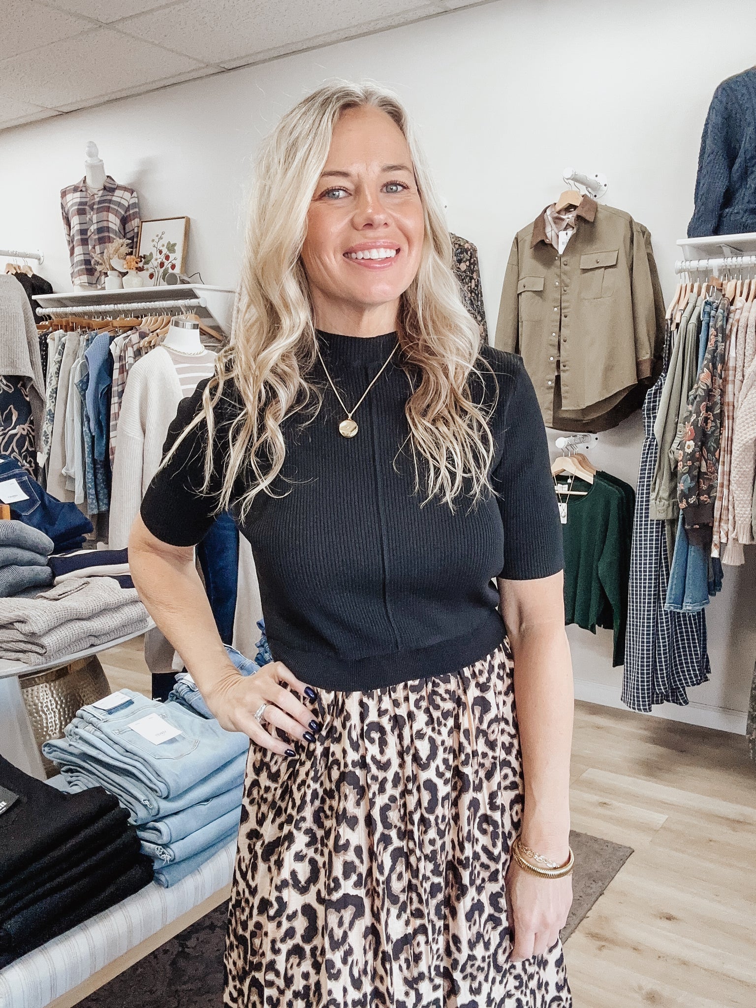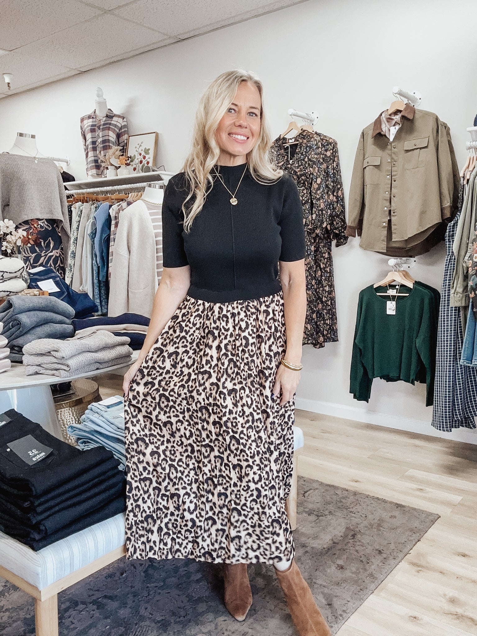 Get the look of a perfectly paired outfit with the ease of a one-and-done piece. The Wild & Chic Knit Top Dress features a fitted black ribbed knit bodice with short sleeves, seamlessly flowing into a soft, flowy leopard-print skirt. The elastic waist gives it a flattering shape while keeping it incredibly comfortable. Style it with boots for fall outings, a denim jacket for daytime, or heels and gold jewelry for a night out. All the polish of separates with none of the effort.