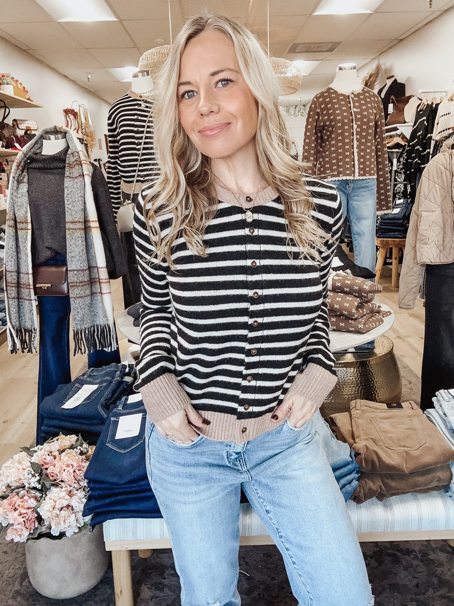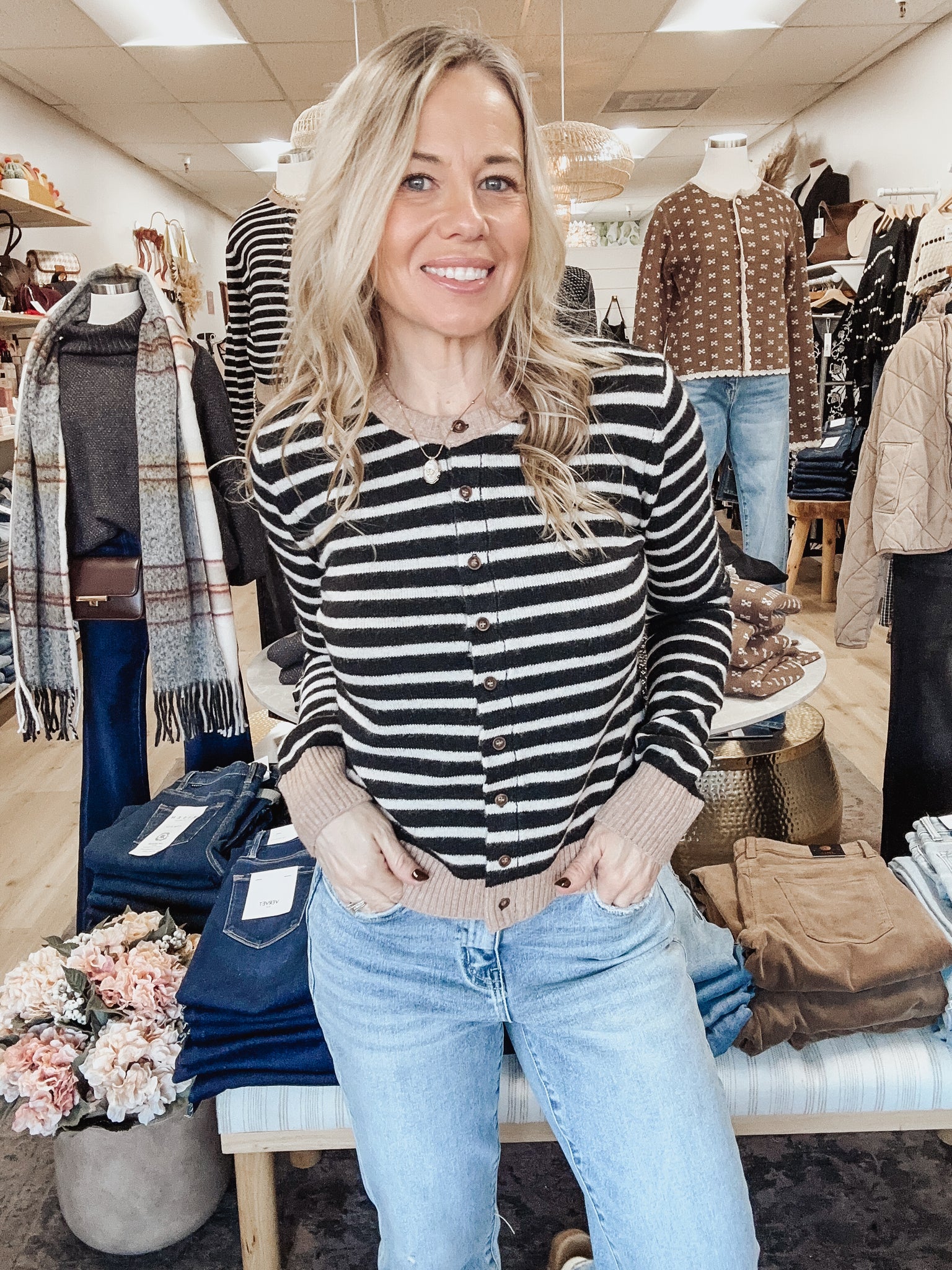 Classic with a modern twist, The Bristol Cardigan is the striped staple you’ll style a hundred different ways. The black and taupe palette feels elevated and effortless, while the button-front silhouette and soft knit keep it wearable for every day.