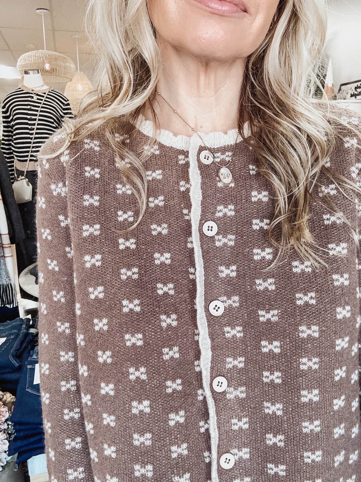 The Finch Lane Cardigan is a beautifully detailed, vintage-inspired knit featuring a delicate stitched motif and contrast cream trim. Its soft, lightweight feel and slightly cropped silhouette make it an easy statement layer you can wear buttoned as a top or open over your favorite basics.