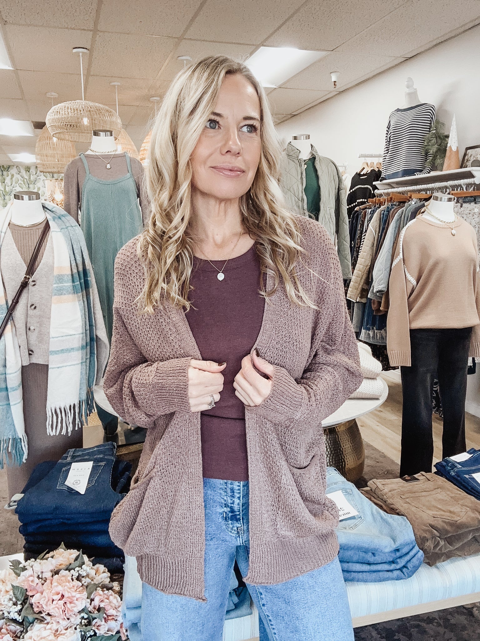 The Hawthorne Open-Knit Cardigan is the kind of layer you’ll grab without even thinking about it. Lightweight with a relaxed drape, this open-front cardigan features a softly textured knit, roomy front pockets, and an easy fit that works year-round.