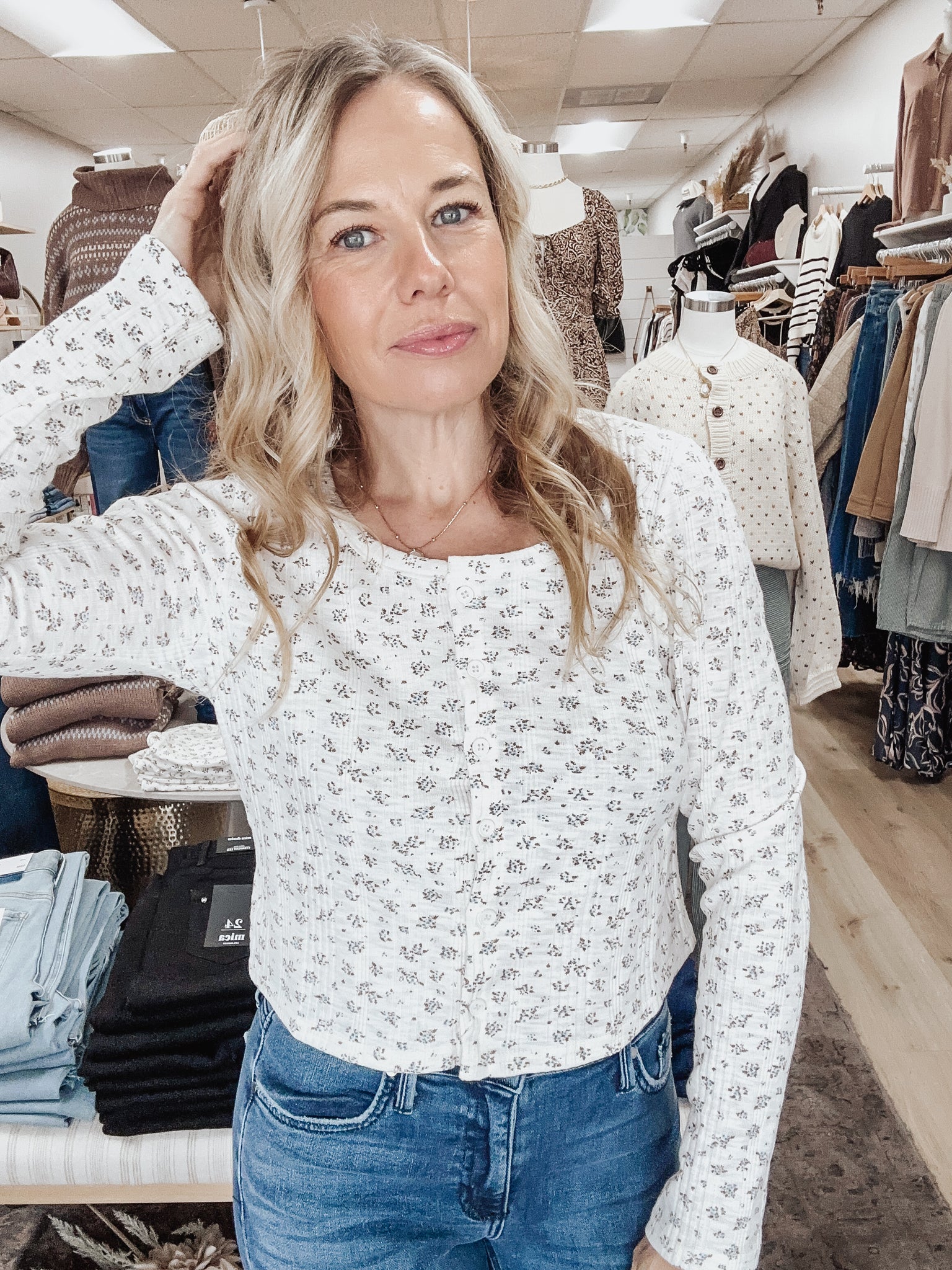 Soft, feminine, and subtly classic — the Meadow Lane Ribbed Top is the easy long sleeve you’ll reach for all season long. Designed in a lightweight ribbed knit with a delicate ditsy floral print, this button-front silhouette gives you that perfectly put-together look without any effort. The fit is softly structured yet stretchy, making it ideal for layering under jackets or tucking into your favorite denim.