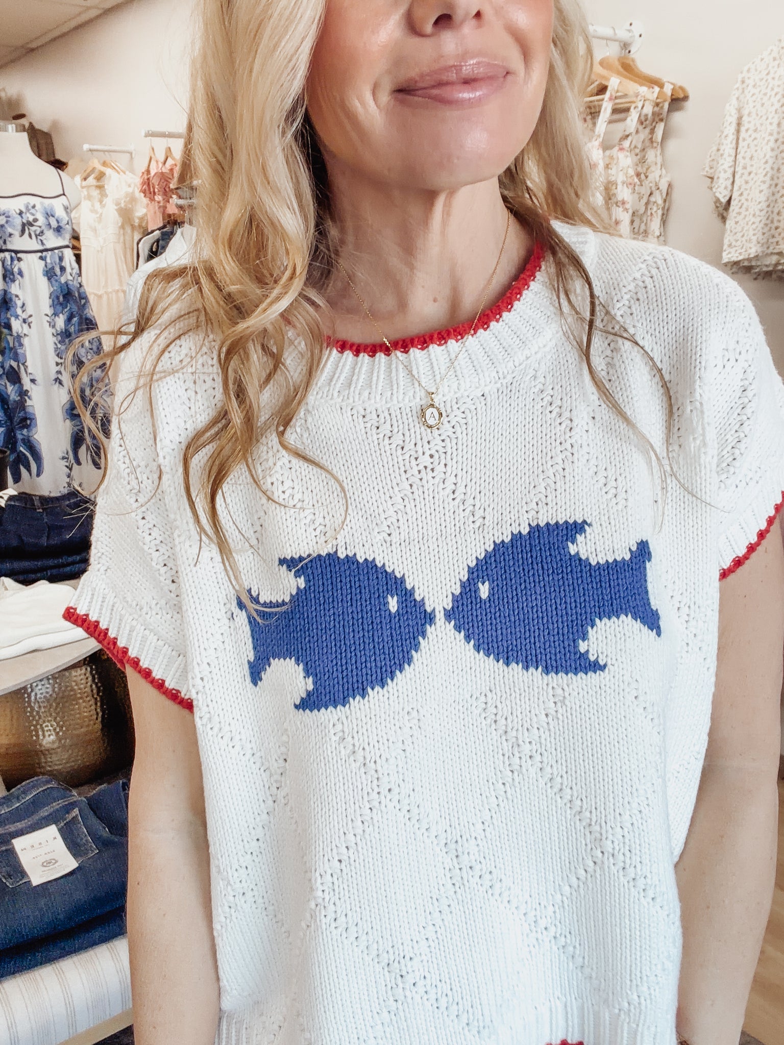 The Nantucket Catch Sweater is a lightweight knit with the sweetest coastal detail. Featuring two navy fish front and center, this soft ivory sweater has subtle pointelle texture throughout and red contrast trim at the neckline, sleeves, and hem for that classic Americana touch.