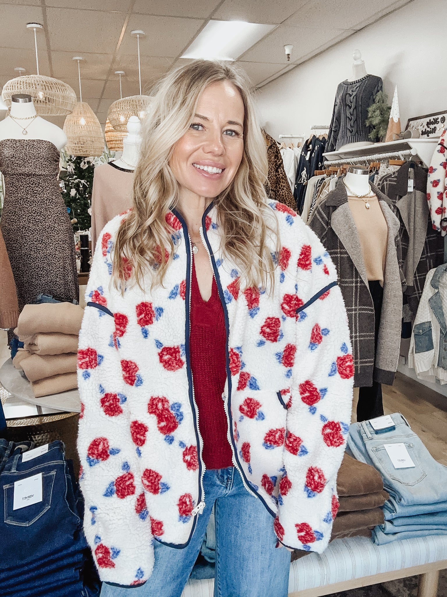 Meet the jacket that brings instant joy to chilly days. The Rosewood Sherpa Zip Jacket features a plush cream sherpa base covered in soft textured red + blue floral blooms — a playful, vintage-inspired pattern that feels both feminine and cozy. Designed with a full zip front, contrast trim, and roomy side pockets, it’s the perfect throw-on-and-go layer for running errands, heading to a holiday brunch, or adding a pop of color to a simple jeans-and-tee outfit. Warm, whimsical, and wonderfully soft — she’s a winter mood booster.