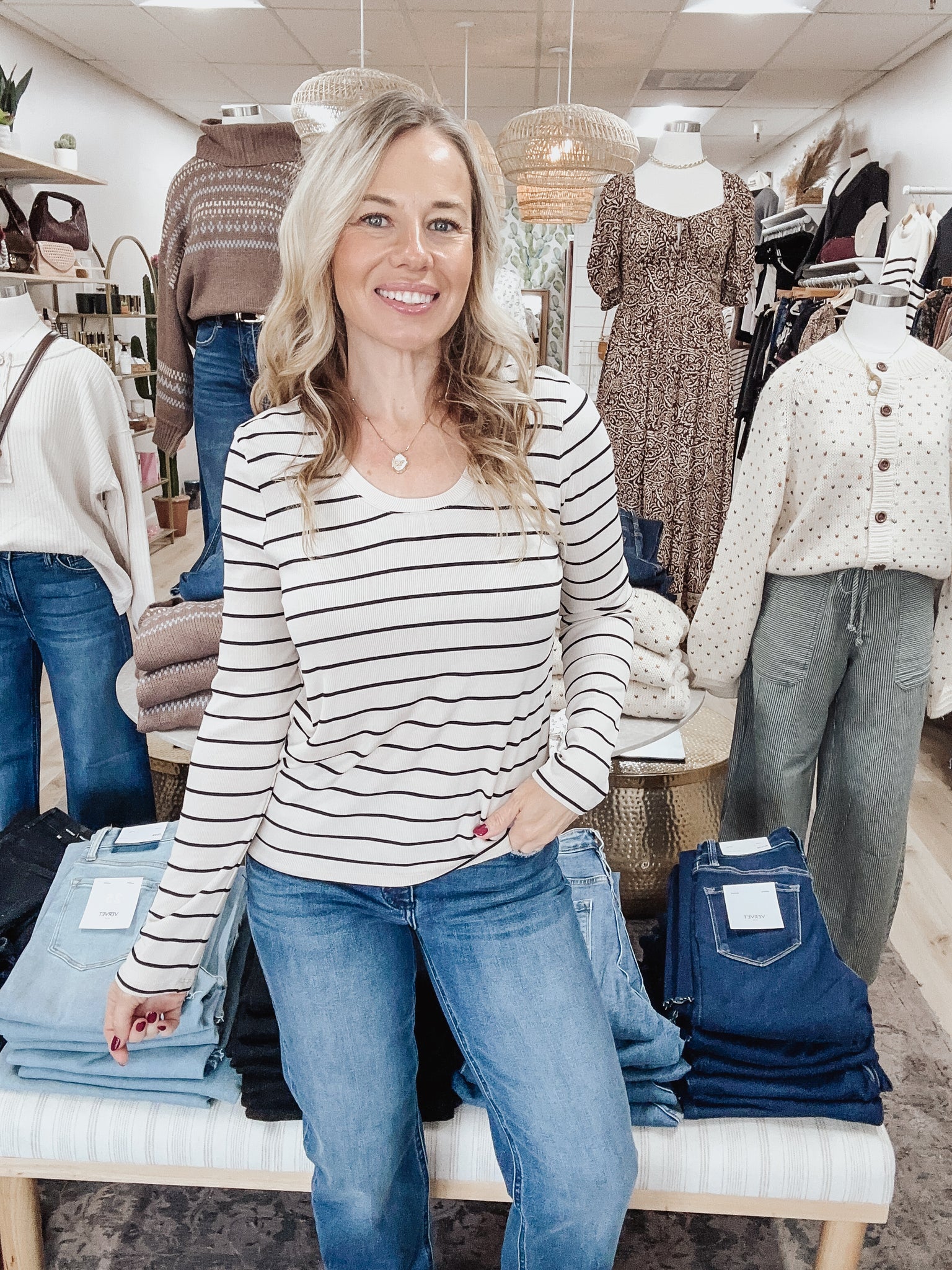 Wear it with denim for a clean, easy look, tuck it into trousers for something more polished, or keep it cozy at home — this top is truly a year-round staple. Available in solid black or an ivory stripe for a classic, elevated vibe.