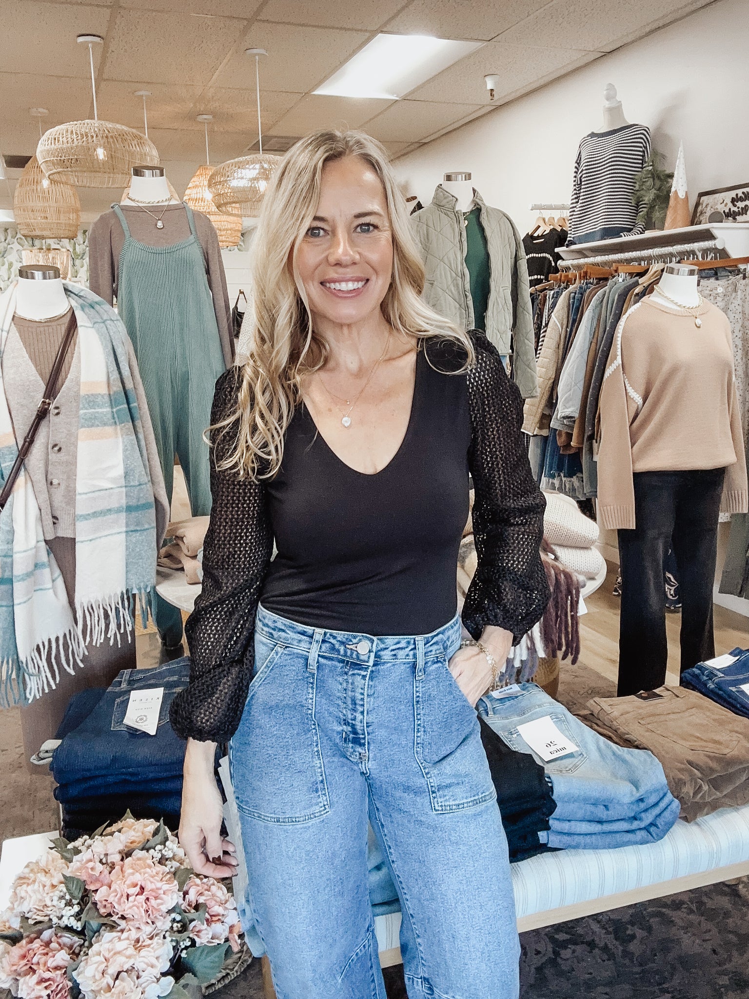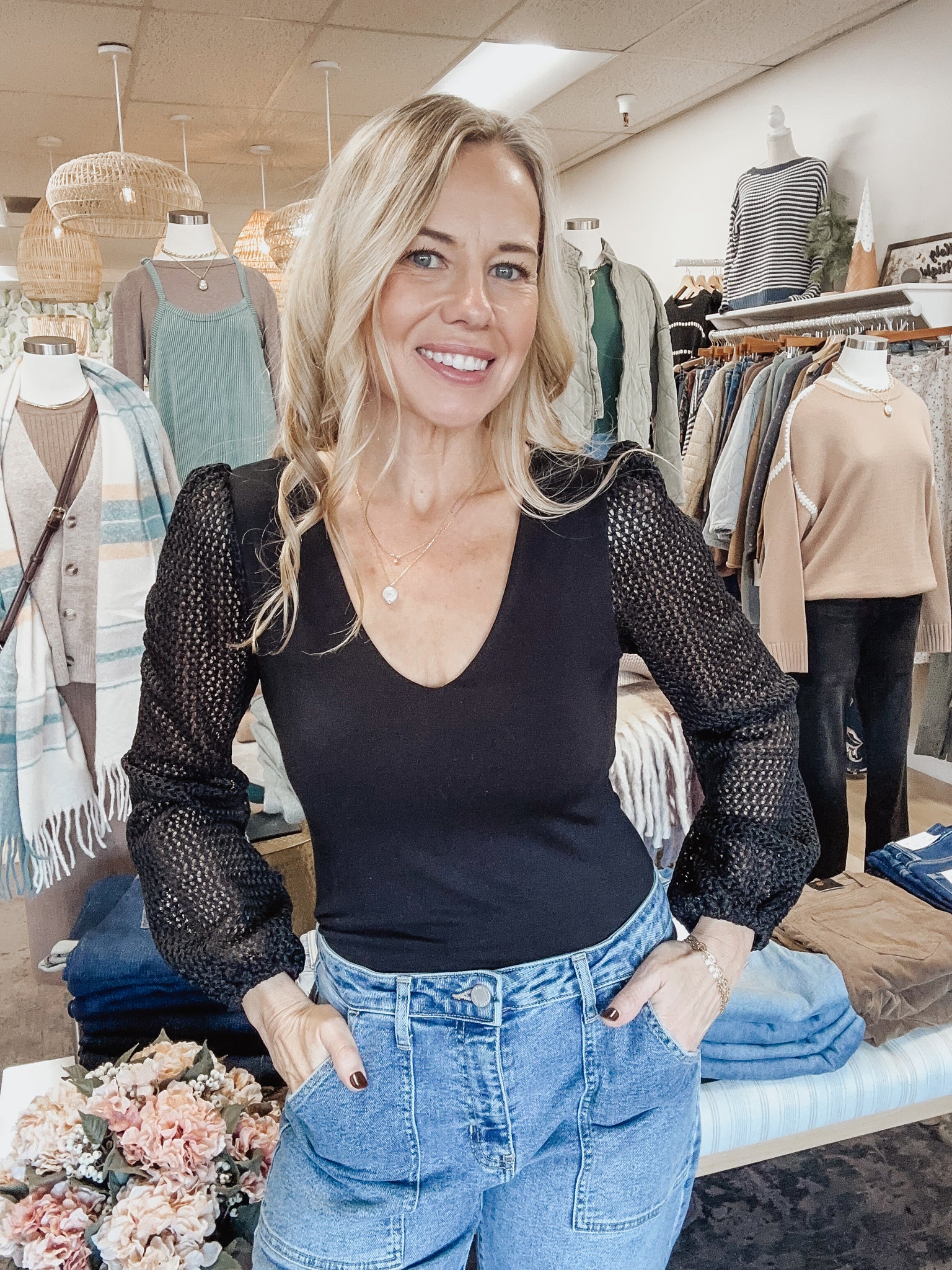 Meet The Whitmore Bodysuit — a timeless staple with elevated detail. Designed with a smooth, fitted body and soft V-neckline, this bodysuit is all about clean lines balanced by statement sleeves. The sheer open-knit long sleeves add texture and interest while still feeling refined and wearable.