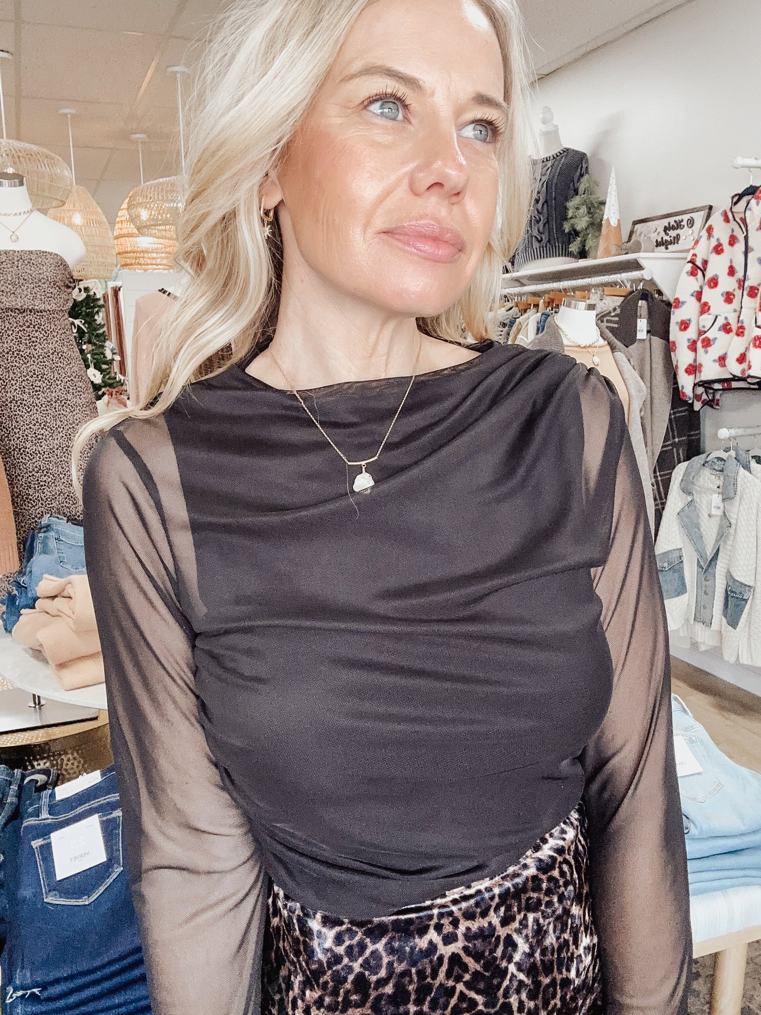 The After Hours Mesh Bodysuit is your new go-to for elevated nights out. Designed with sheer mesh sleeves, a soft ruched bodice, and a sleek, smoothing fit, this piece creates the most flattering, tucked-in silhouette.
