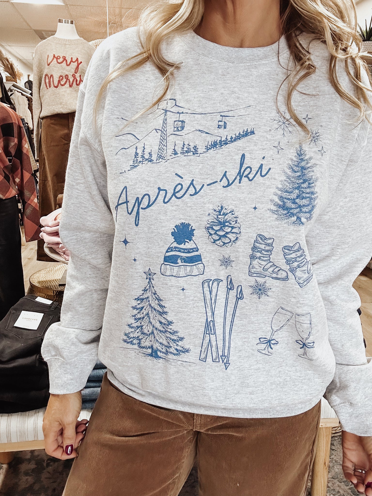 Meet your new winter staple. The Après Chalet Sweatshirt is a cozy grey crewneck with the cutest alpine-inspired graphic — skis, trees, champagne, and all the après moments you love. Soft on the inside with a relaxed, easy fit, this is the sweatshirt you’ll throw on after a day out running errands, heading to the mountains, or curling up at home with a mug of cocoa.