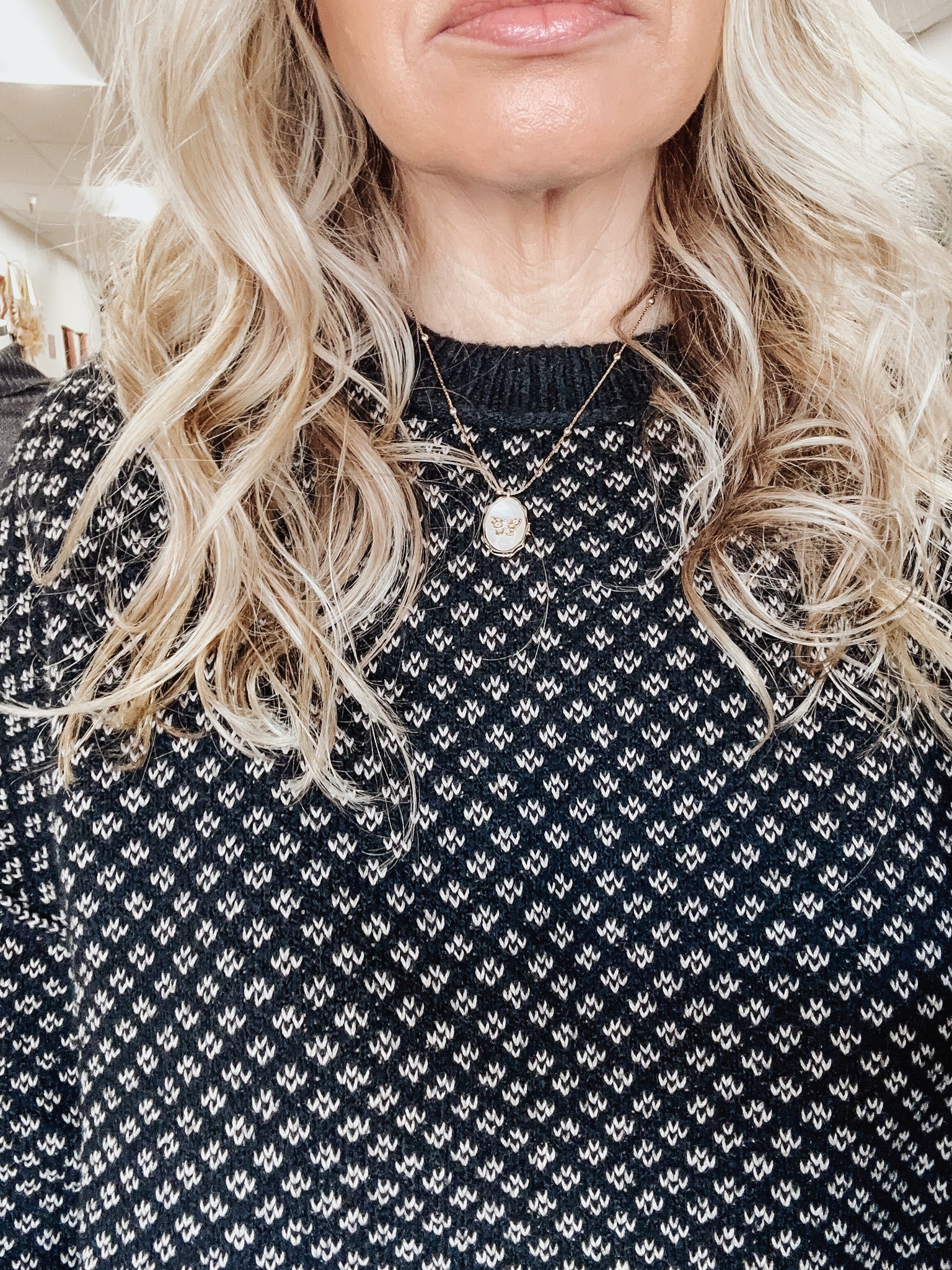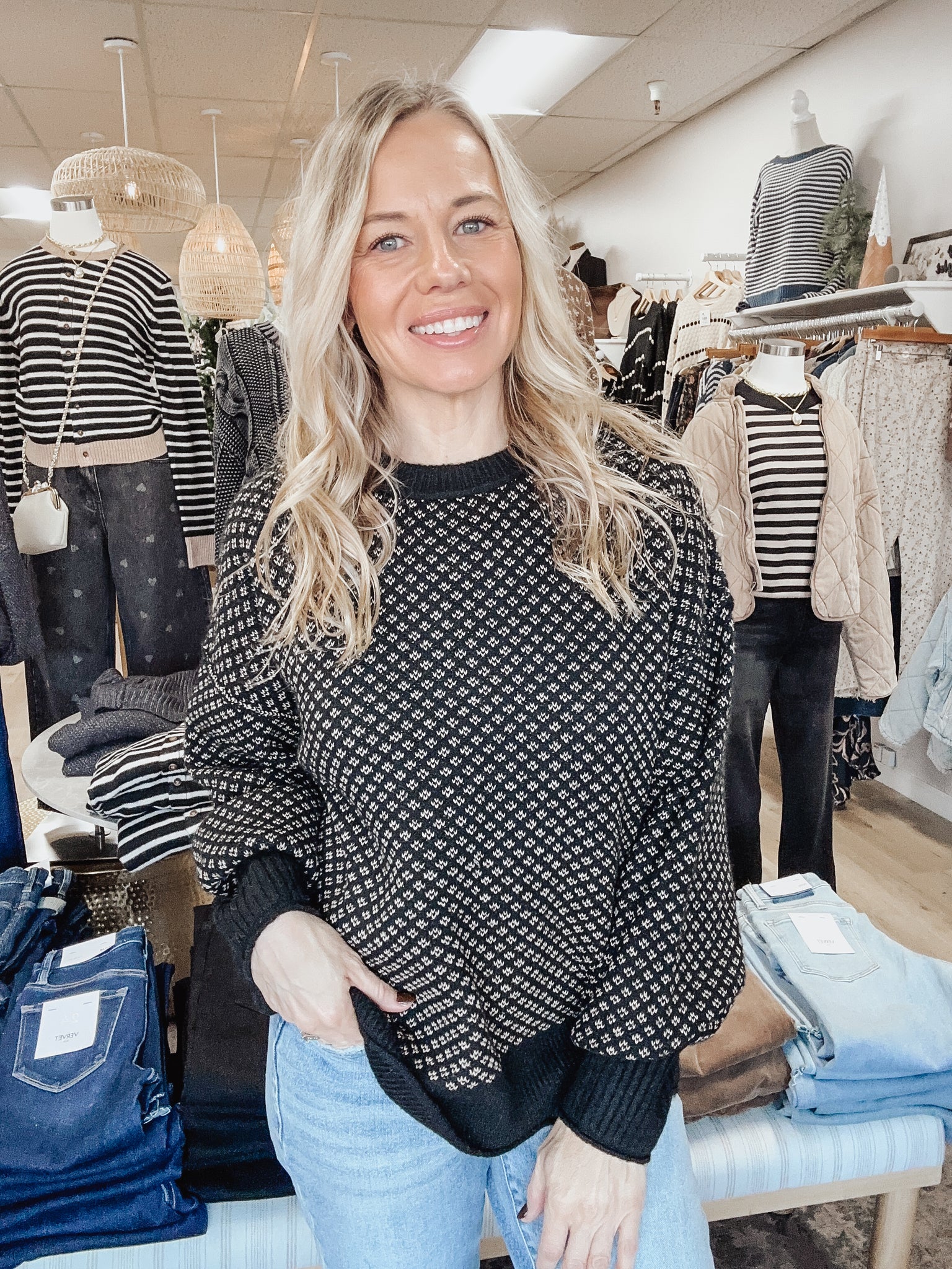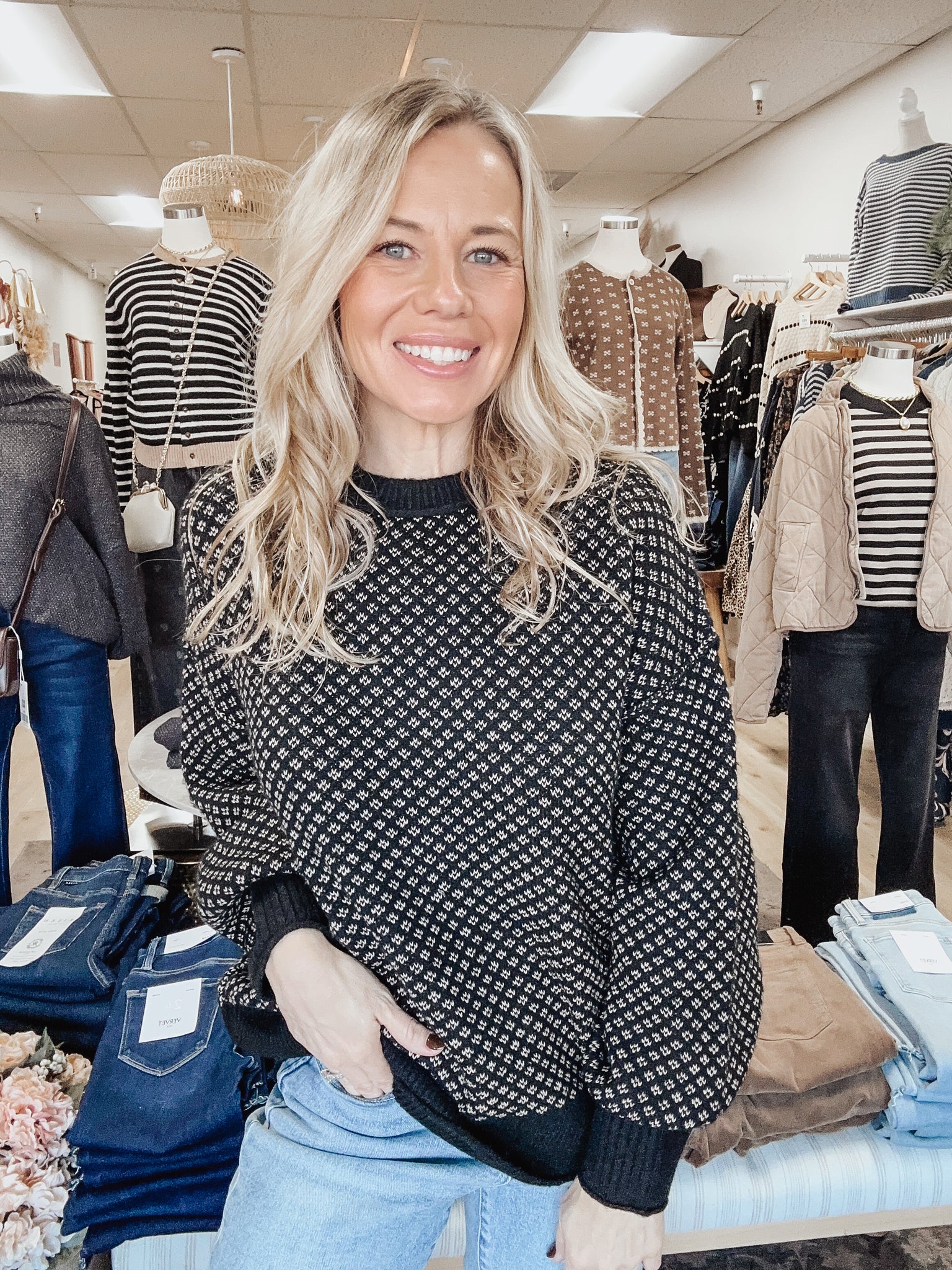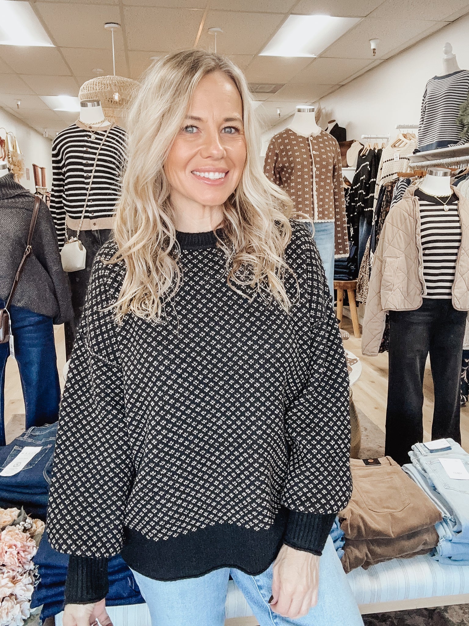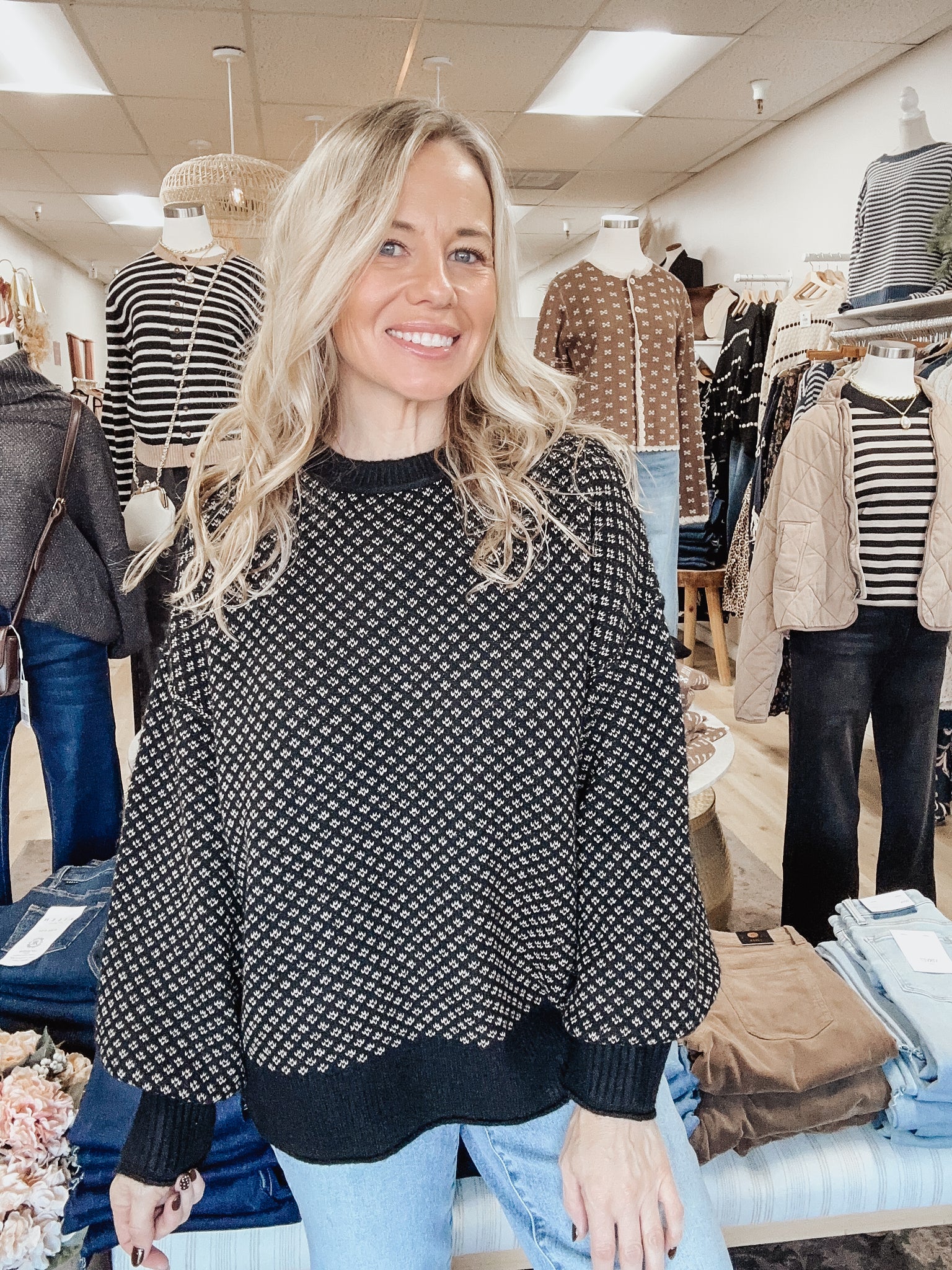 Meet the Astoria Knit Sweater, a classic patterned knit with a modern, relaxed silhouette. The intricate micro-print pattern gives it that elevated, old-money charm while the soft knit and easy drape keep it perfectly cozy for everyday wear.