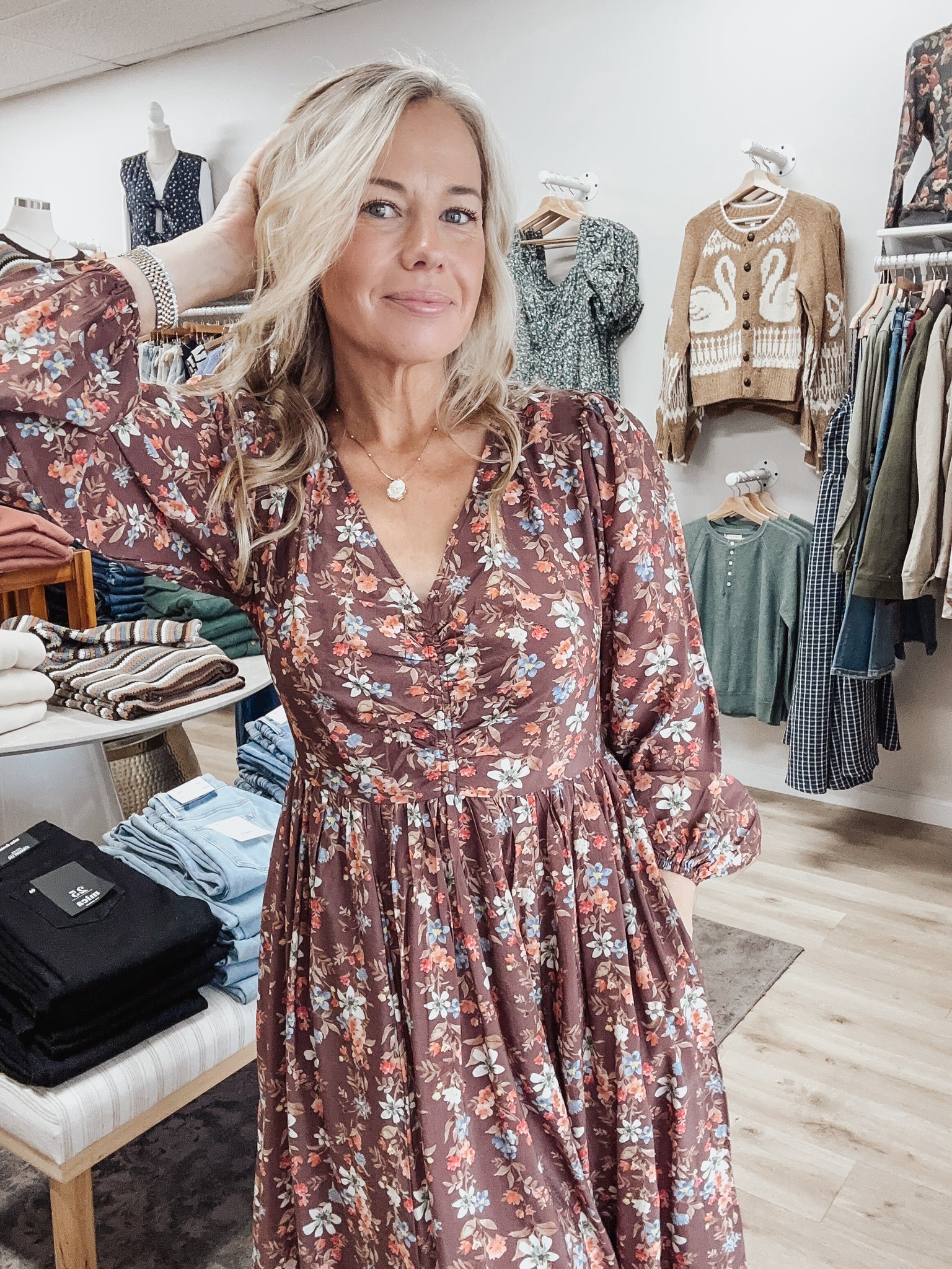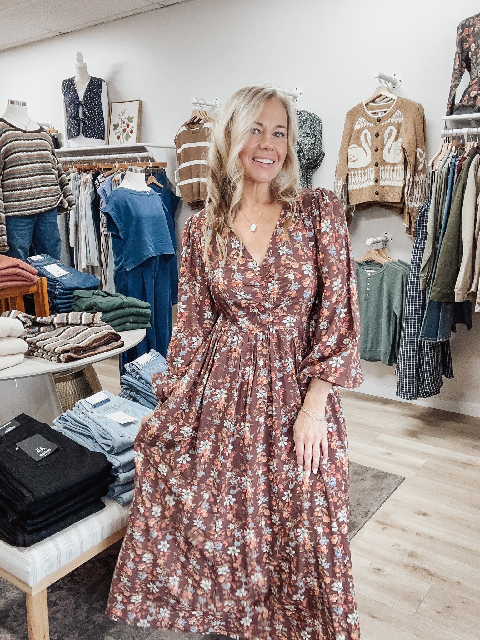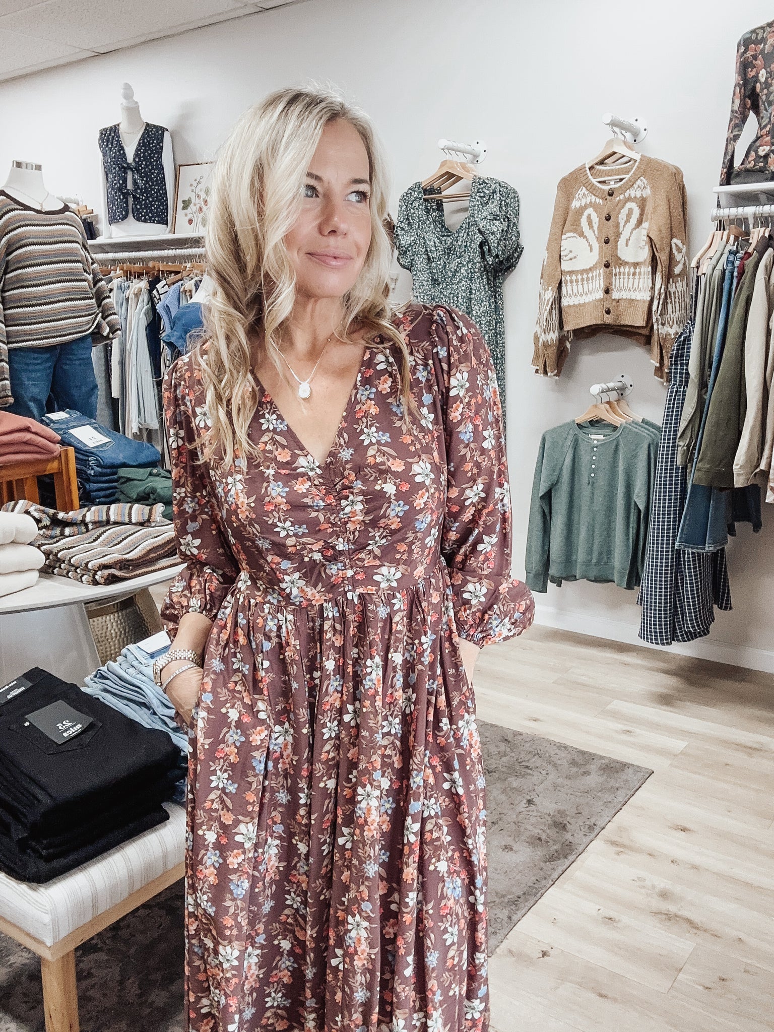 The Autumn Bloom Maxi is fall florals done right. Designed with a rich chocolate-brown base and a cascade of vibrant blossoms, this dress features a flattering v-neckline, puff sleeves with elastic cuffs, and a side zipper for a seamless fit. It’s lined for comfort, flows effortlessly with every step, and makes the perfect choice for seasonal gatherings, weddings, or simply feeling extra chic on a crisp fall day. Model is wearing a medium.