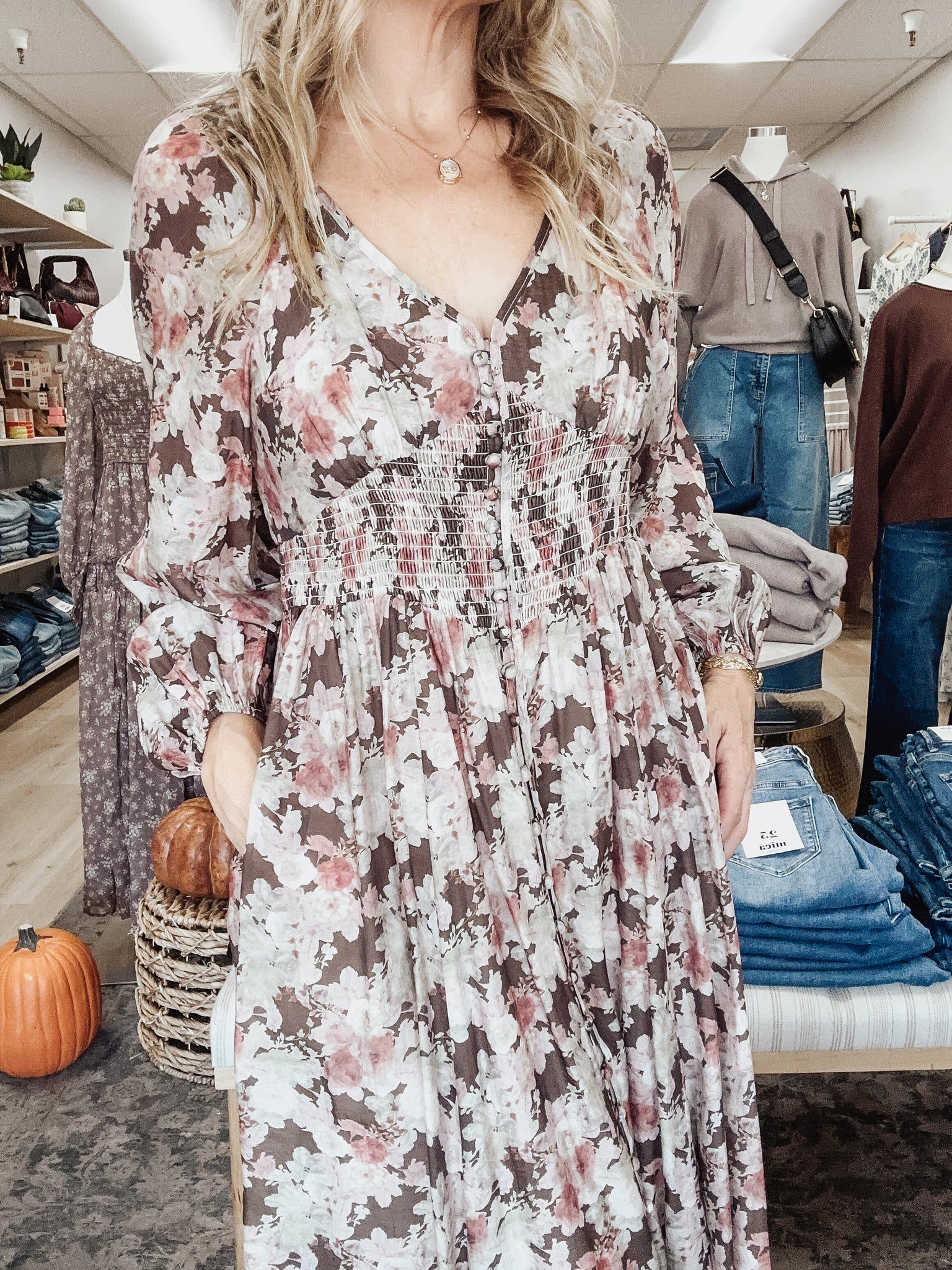 The Autumn Bloom Maxi is all about effortless romance with an autumn twist. Featuring a chocolate base scattered with soft blush and ivory florals, this smocked-waist maxi is flattering and flowy with every step. The lightweight fabric, button-front detail, and long sleeves make it a perfect day-to-night piece—pair it with ankle boots for a seasonal outing or dress it up with heels and gold jewelry for an evening dinner. The model is wearing a medium.