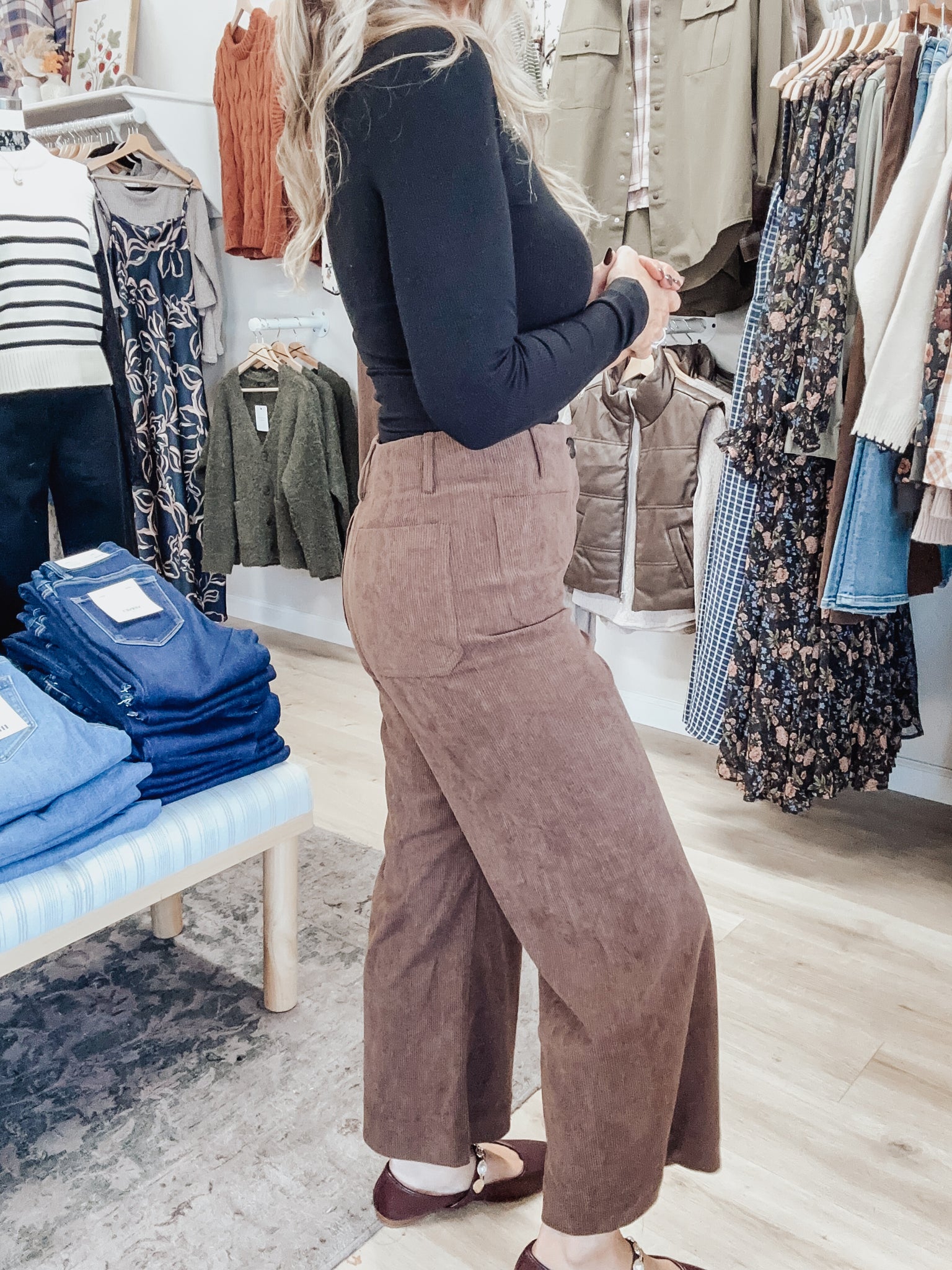 Soft, structured, and fall-ready, the Chestnut Corduroy Wide Leg Pant adds instant texture to your look. Designed with a high-rise waist, patch front pockets, and a relaxed cropped leg, they strike the perfect balance between tailored and cozy. The rich brown corduroy pairs beautifully with knits, bodysuits, and blouses—dress them up with loafers or keep it casual with sneakers. Model is wearing a small.