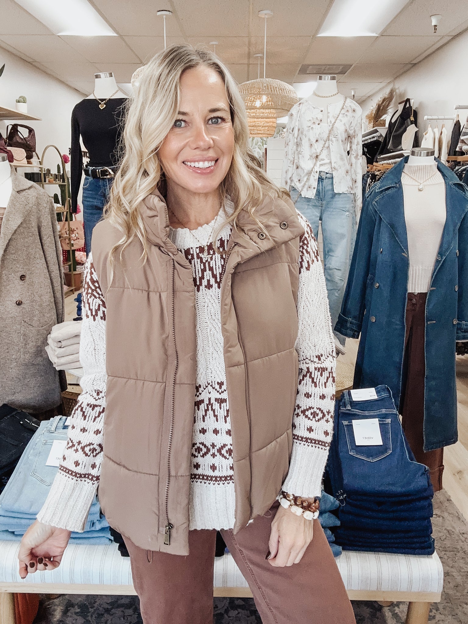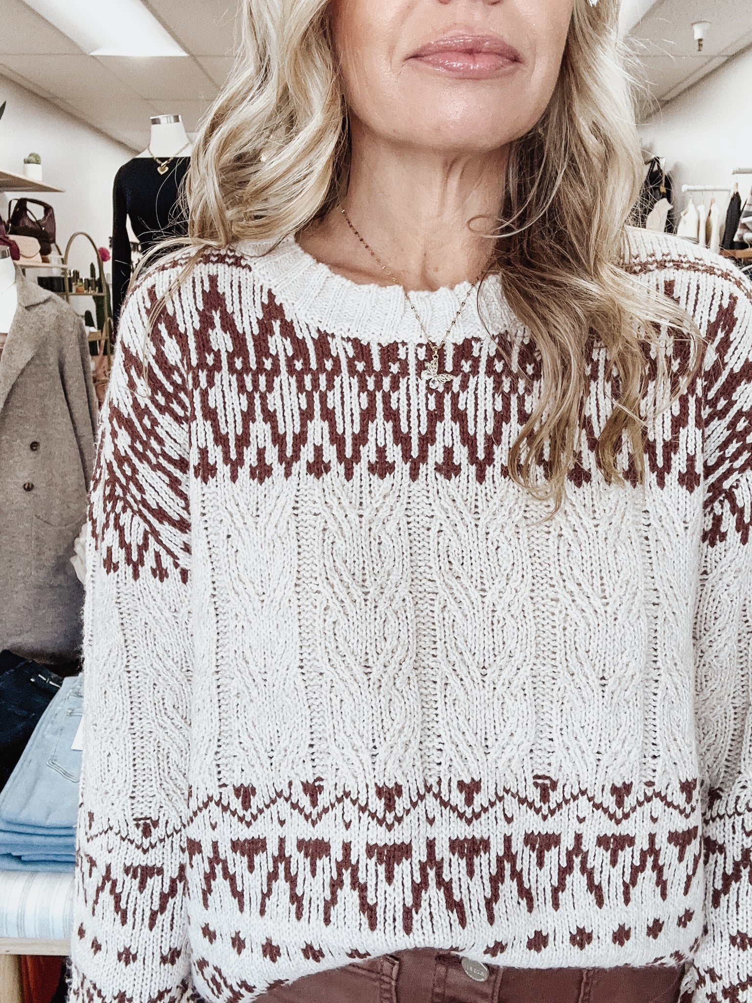 Meet your new fall favorite 🍂 Cozy meets classic in the Chestnut Trails Sweater — featuring a beautifully textured cable knit through the front and sleeves, finished with a rich chestnut fair-isle pattern along the neckline and hem. The relaxed fit makes it easy to front-tuck into denim or your go-to cords for an effortless weekend look. Perfect for pumpkin patch strolls, coffee runs downtown, or keeping warm at Friday night lights.