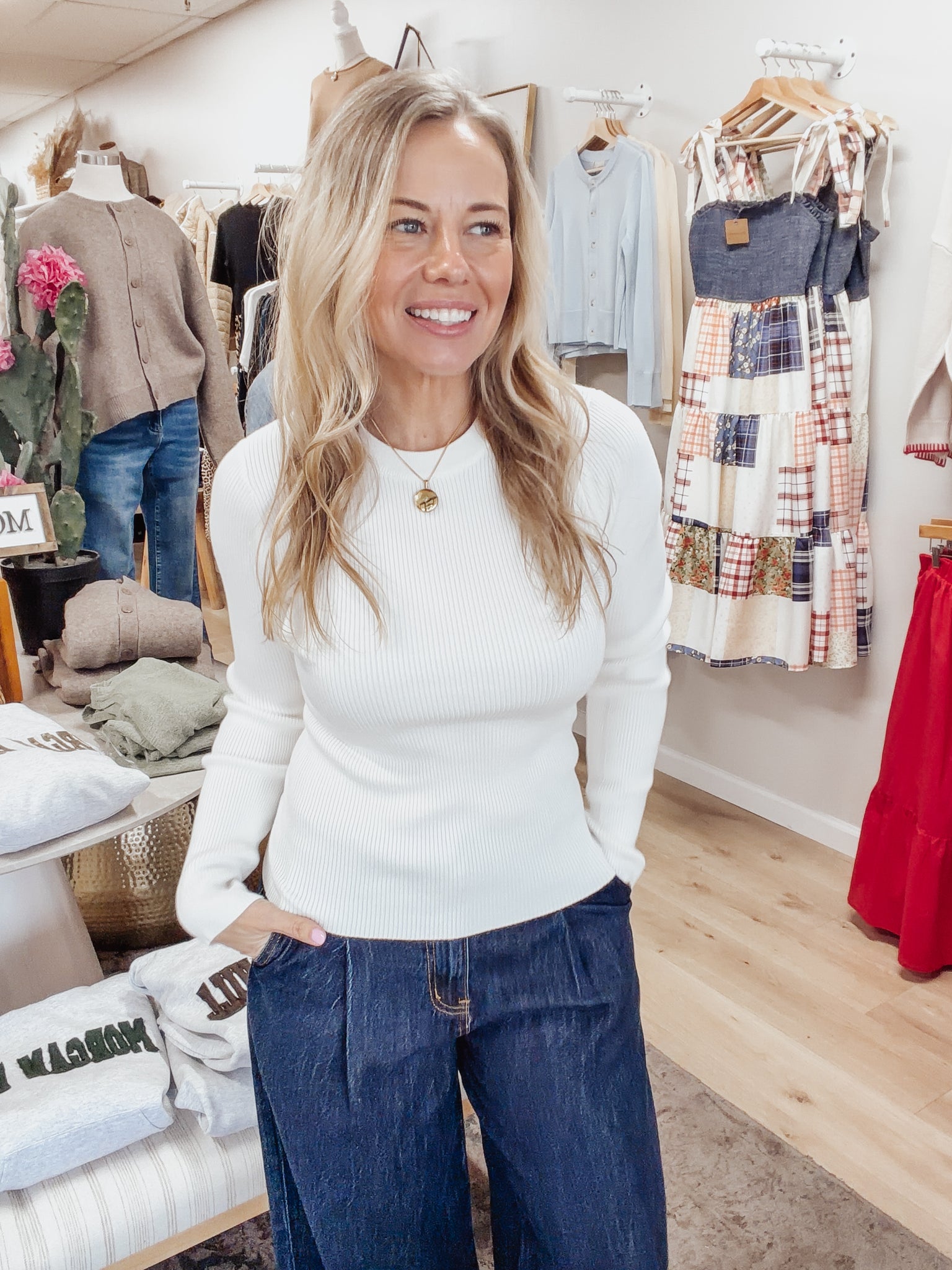 Style it with dark wash jeans and gold jewelry for a clean, elevated everyday look, or tuck it into wide leg trousers for a refined, classic outfit. This is the piece you’ll reach for on repeat.