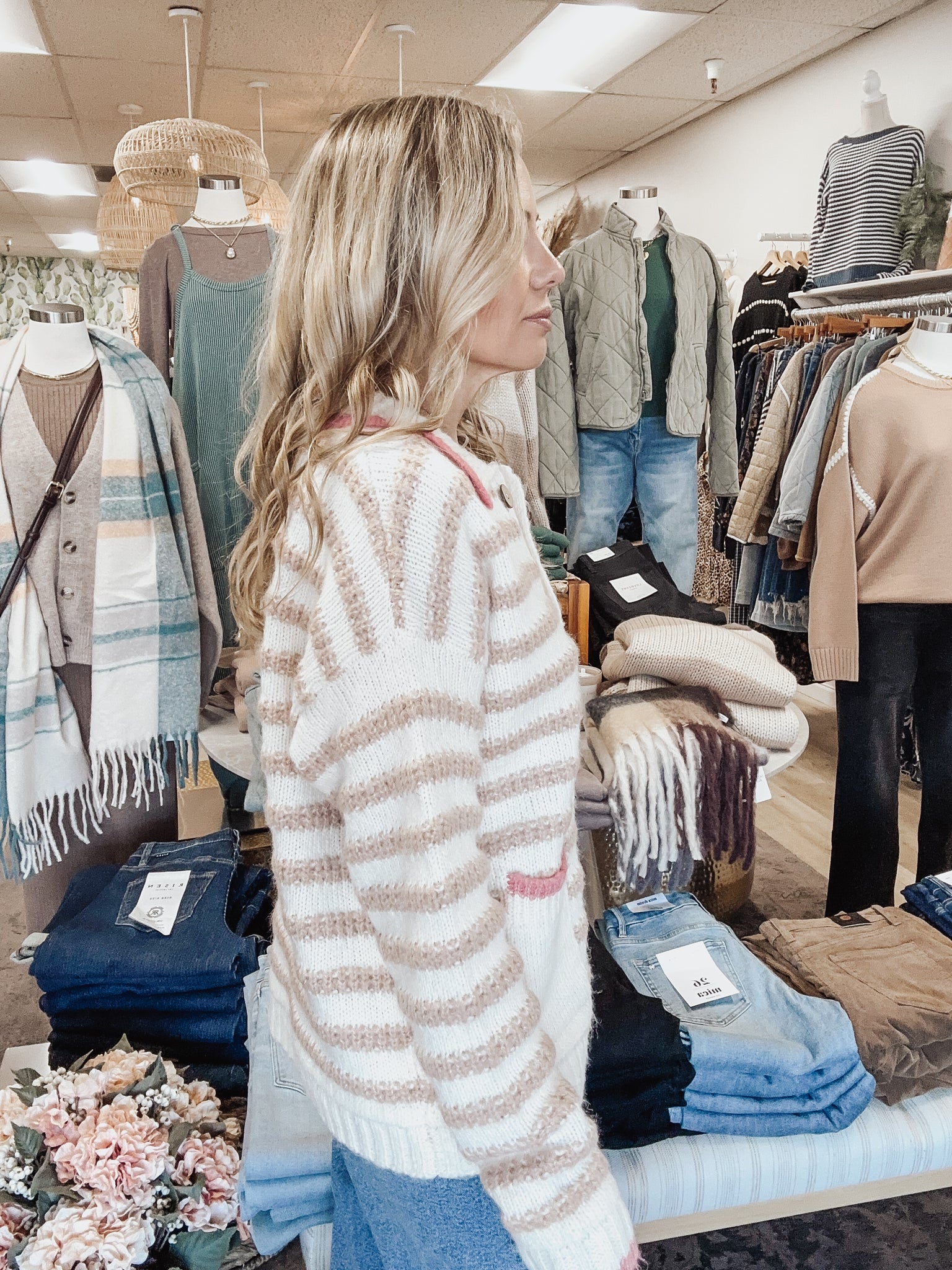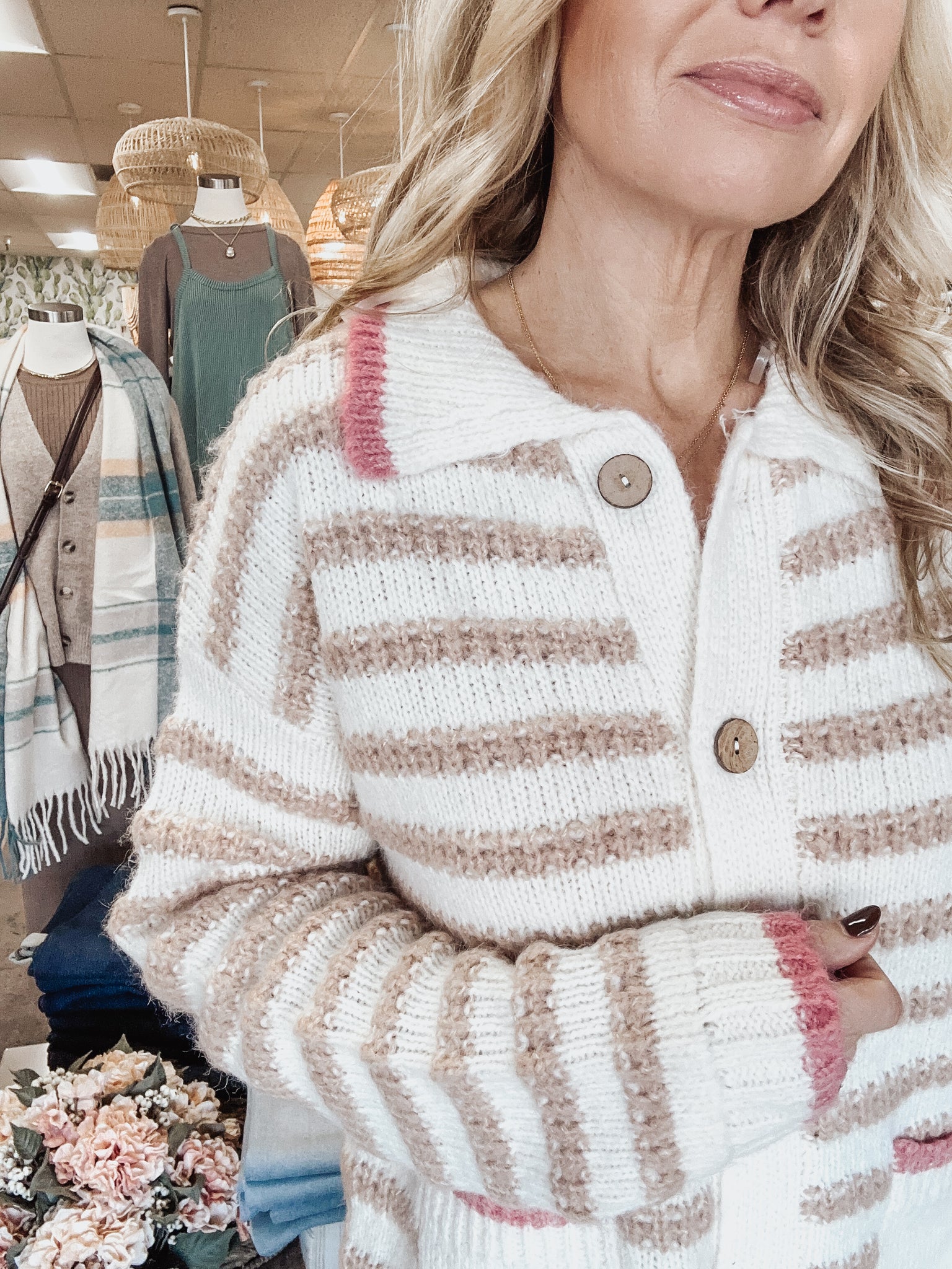 The Cottage Row Cardigan is a timeless layering piece with a cozy, refined feel. Designed with a classic collar neckline, button-front closure, and soft neutral striping, this cardigan brings effortless polish to everyday outfits.