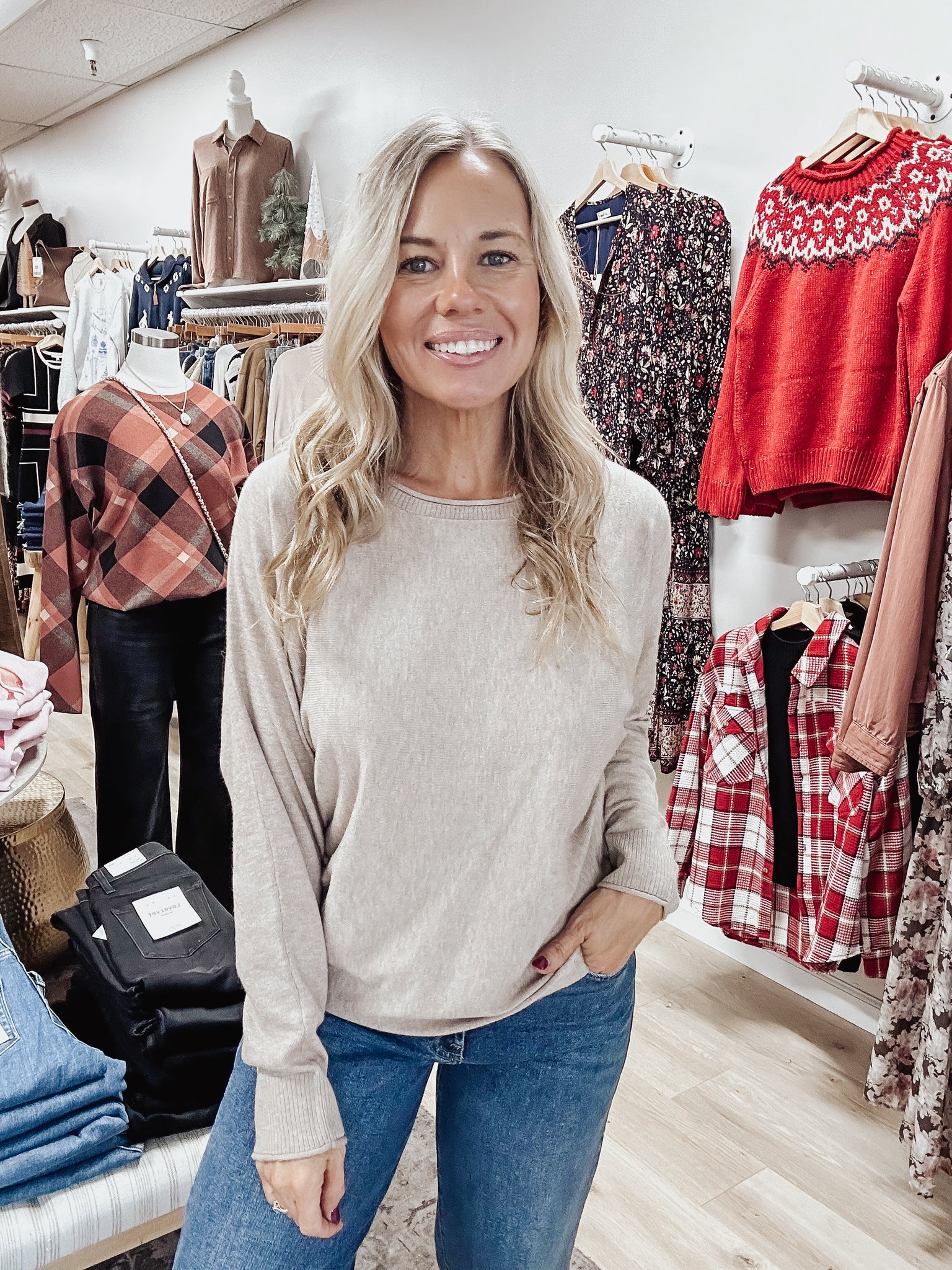 The Cottage Trail Knit Top is the soft, everyday neutral your wardrobe has been waiting for. Made with a lightweight brushed knit, it drapes beautifully with a relaxed silhouette and subtle heathered texture. This effortless long-sleeve pairs perfectly with denim for a cozy, polished look — ideal for slow mornings, school drop-offs, or weekend strolls through town.