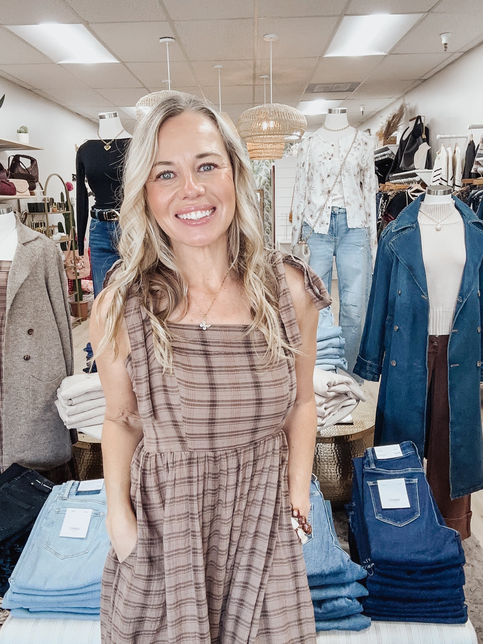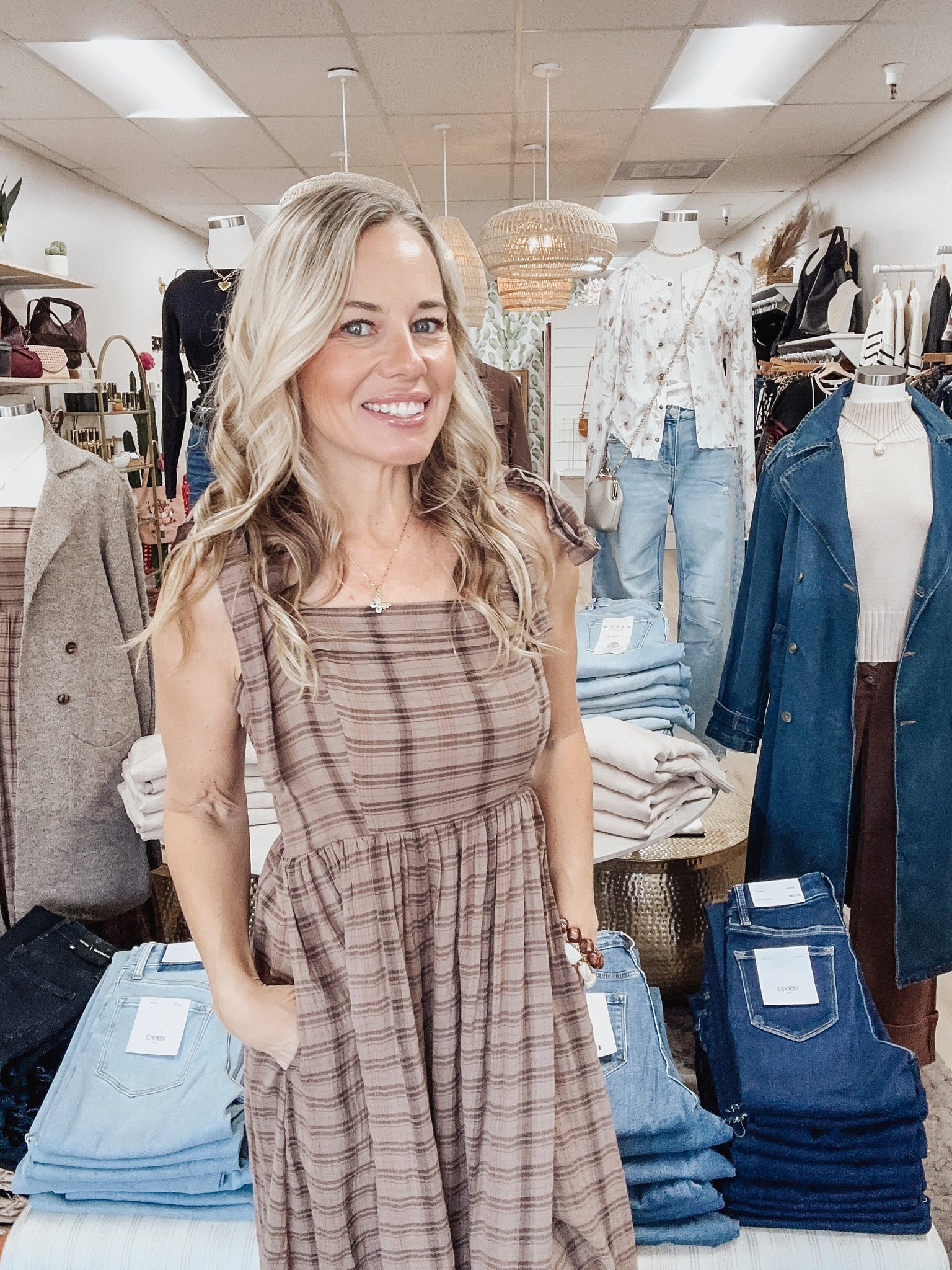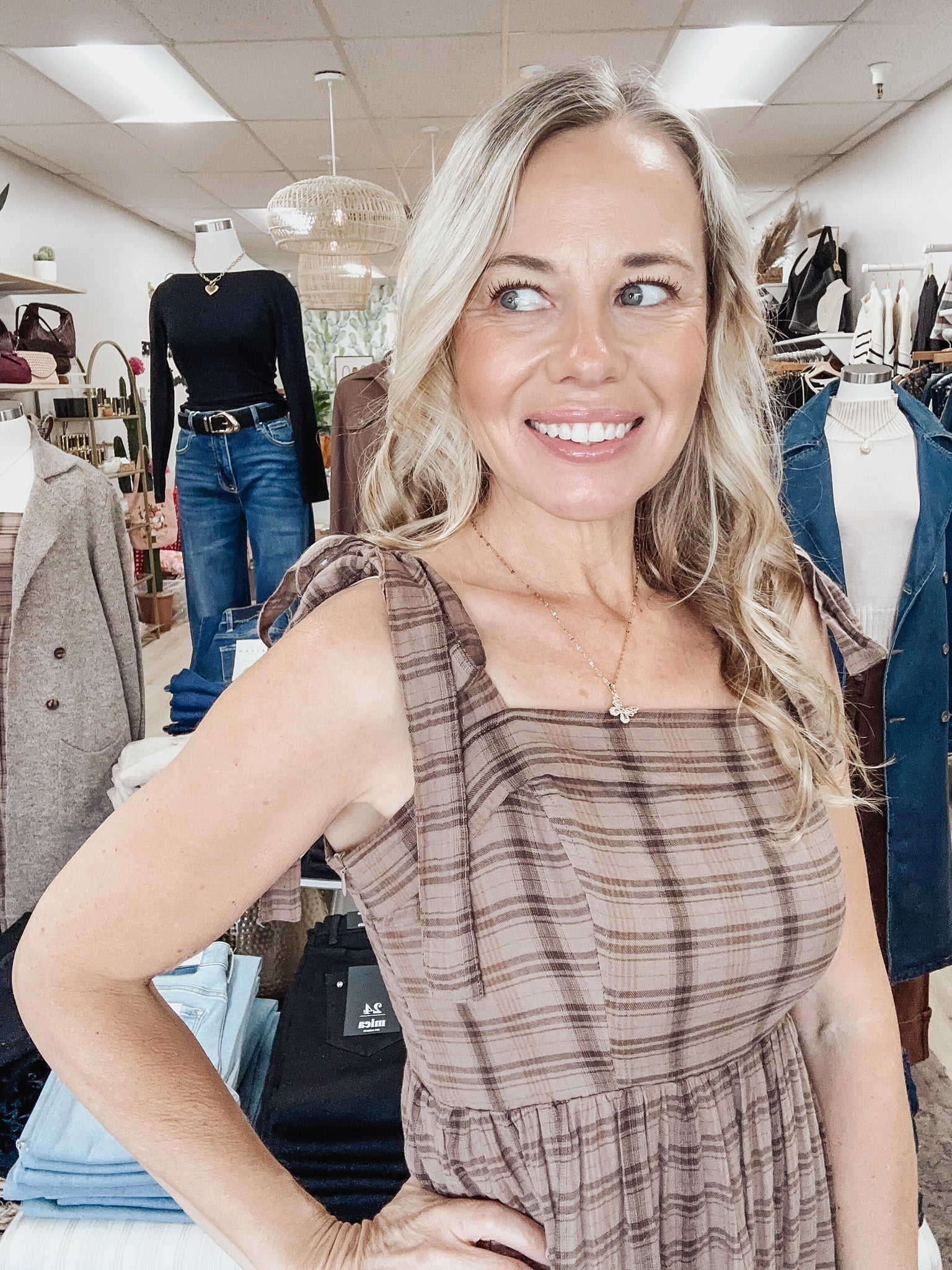 Cozy plaid meets timeless charm. This cotton maxi dress features a soft brown tartan print, adjustable tie shoulders for the perfect fit, pockets (of course!), and a tiered hem that moves beautifully with you. The relaxed silhouette makes it an easy go-to for fall outings — apple picking, pumpkin patch dates, Thanksgiving dinner, or just a casual day at The Cactus Lounge. Style with your favorite booties and a denim or sherpa jacket when the temps drop.
