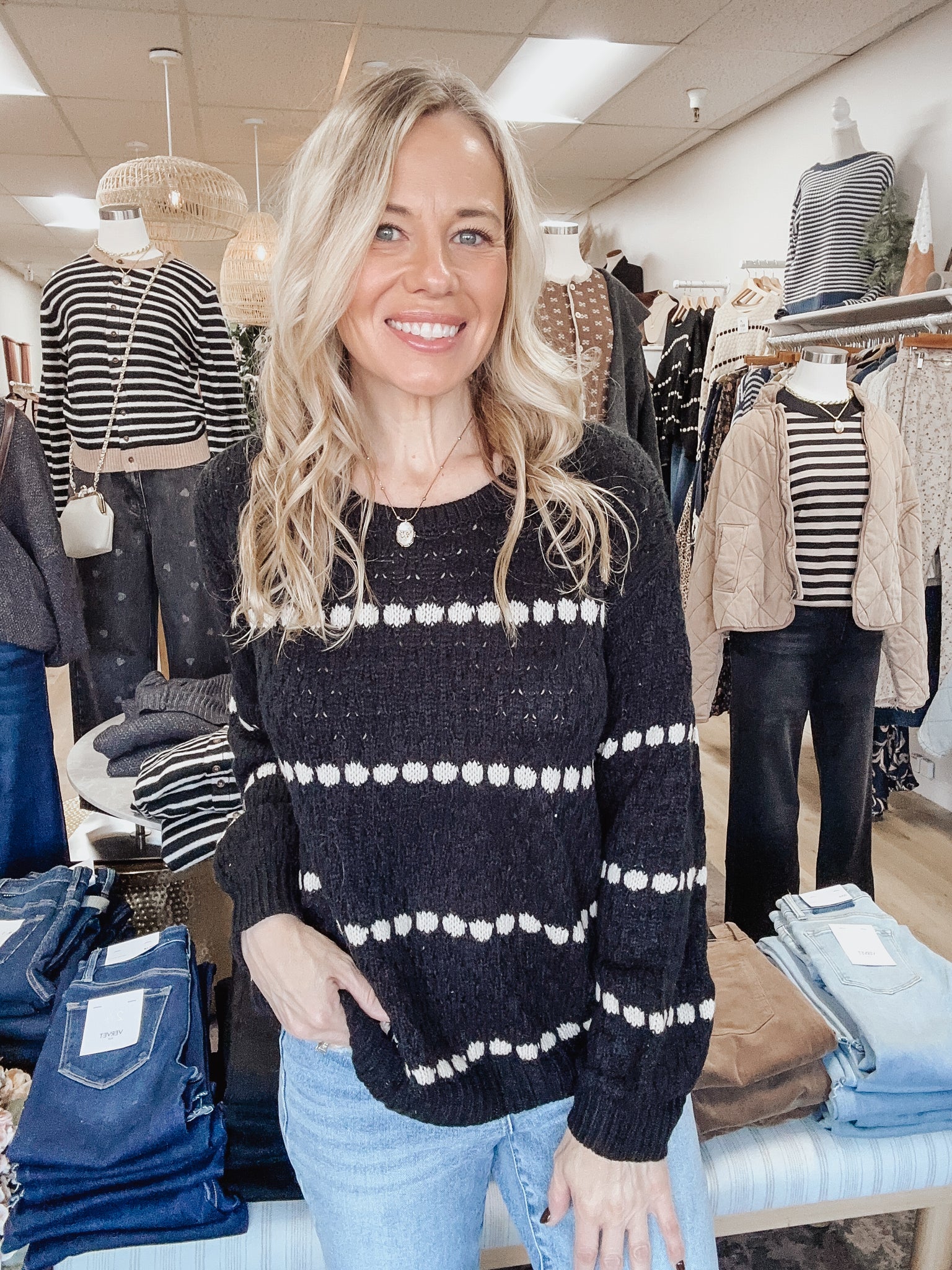 Meet the Marlowe Dot Stripe Sweater, a soft, textured knit that blends effortless comfort with classic style. Designed with subtle dot-stripe detailing, a relaxed fit, and cozy ribbed cuffs, this sweater feels perfectly lived-in while still looking polished.
