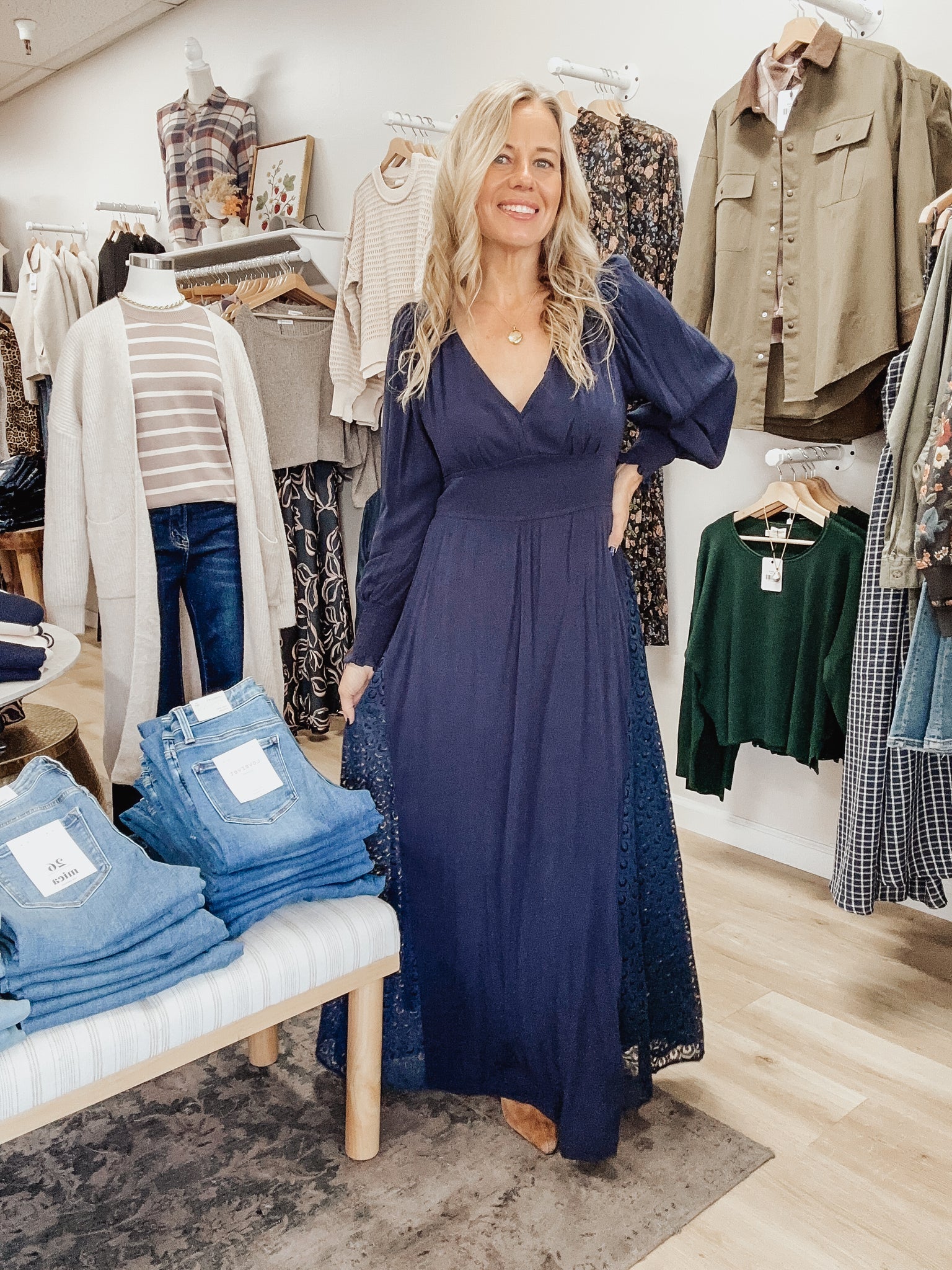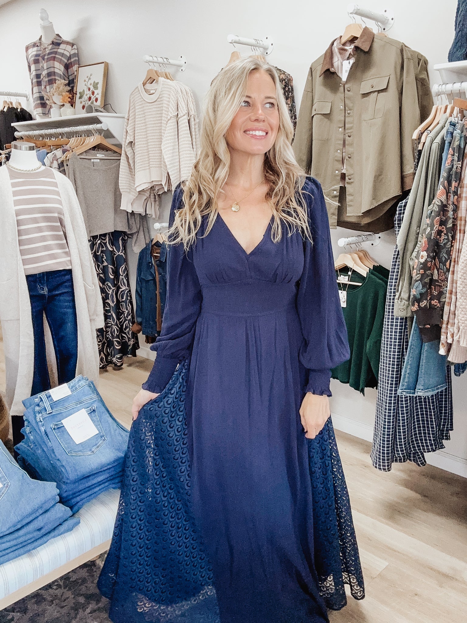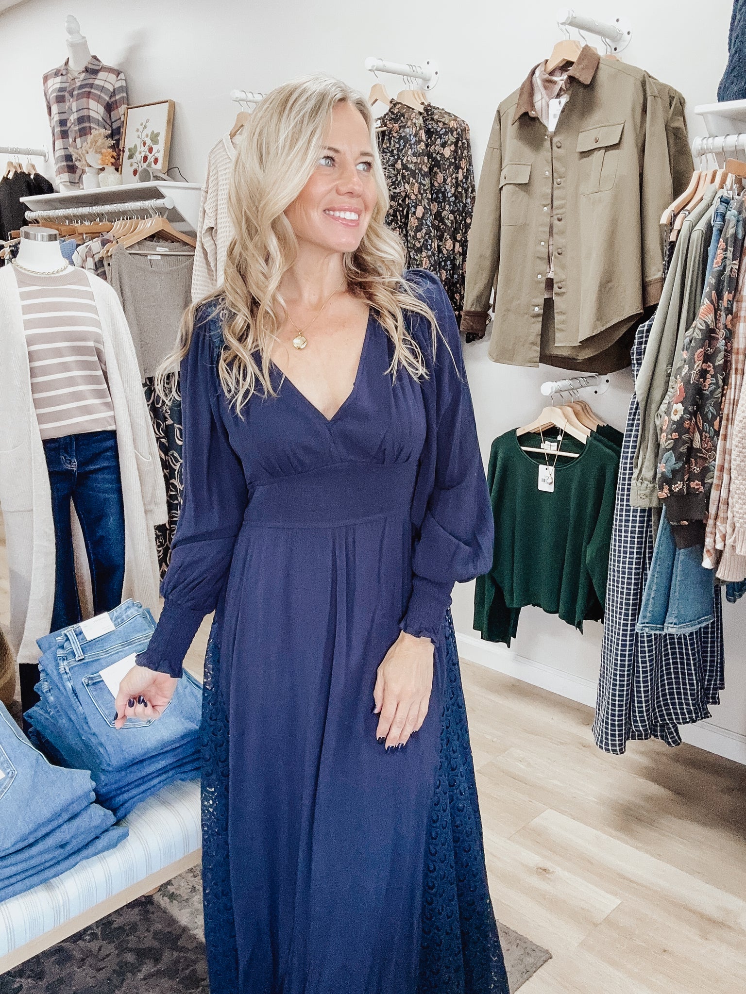 The Midnight Riviera Maxi is elegance with a hint of boho charm. This deep navy dress features a flattering v-neckline, long blouson sleeves, and a smocked waist that defines the shape without sacrificing comfort. The standout detail? The lace insets along the skirt and shoulders that add movement and texture, plus a delicate tie-back with a keyhole opening for an elevated finish. Style it with boots for a fall event, heels for a wedding guest look, or dress it down with a denim jacket. Model is wearing a medium.