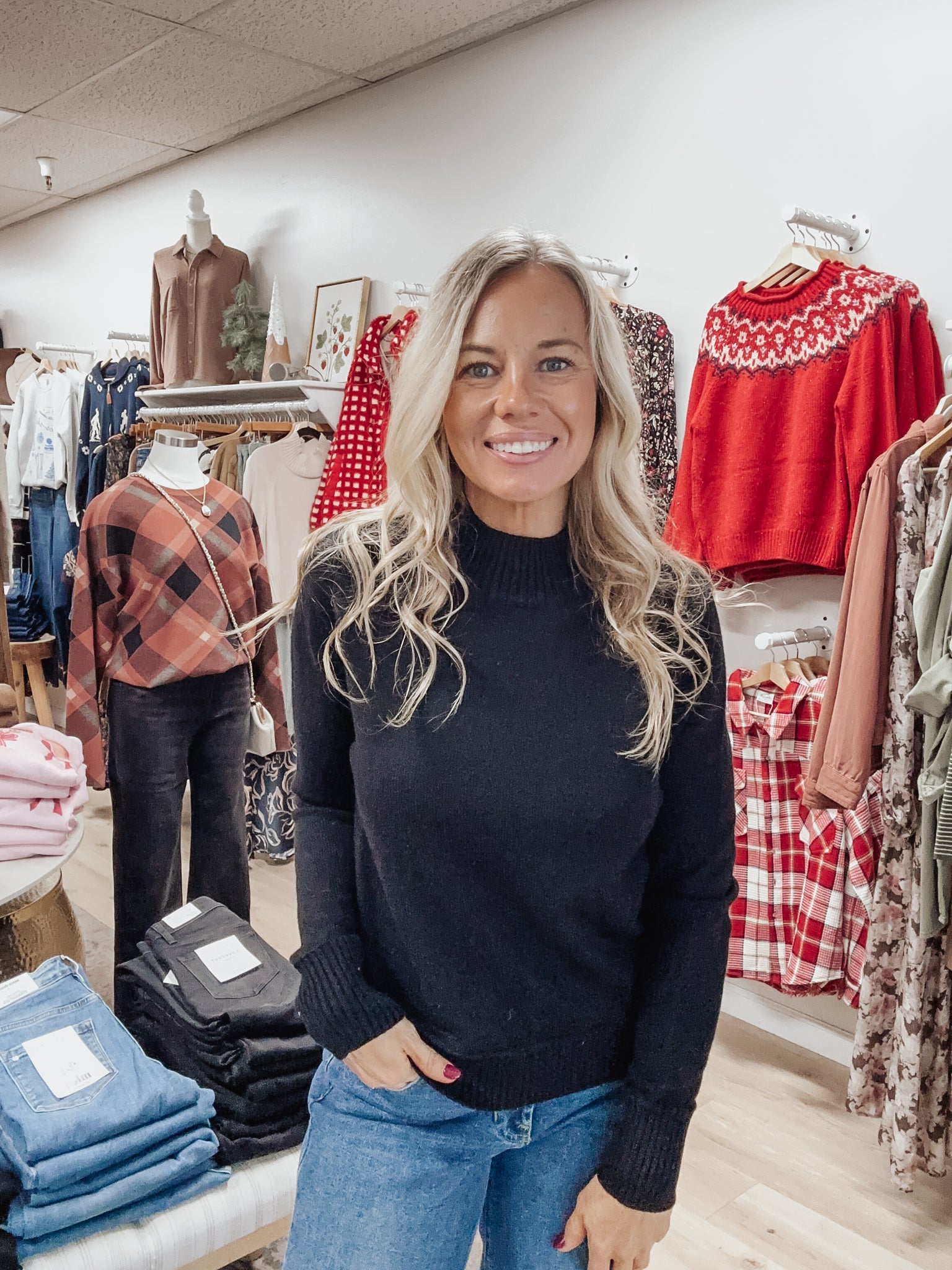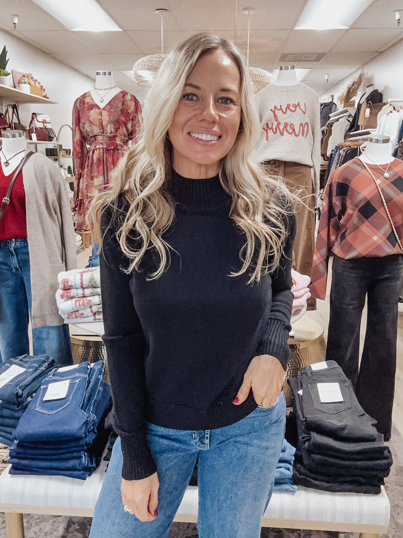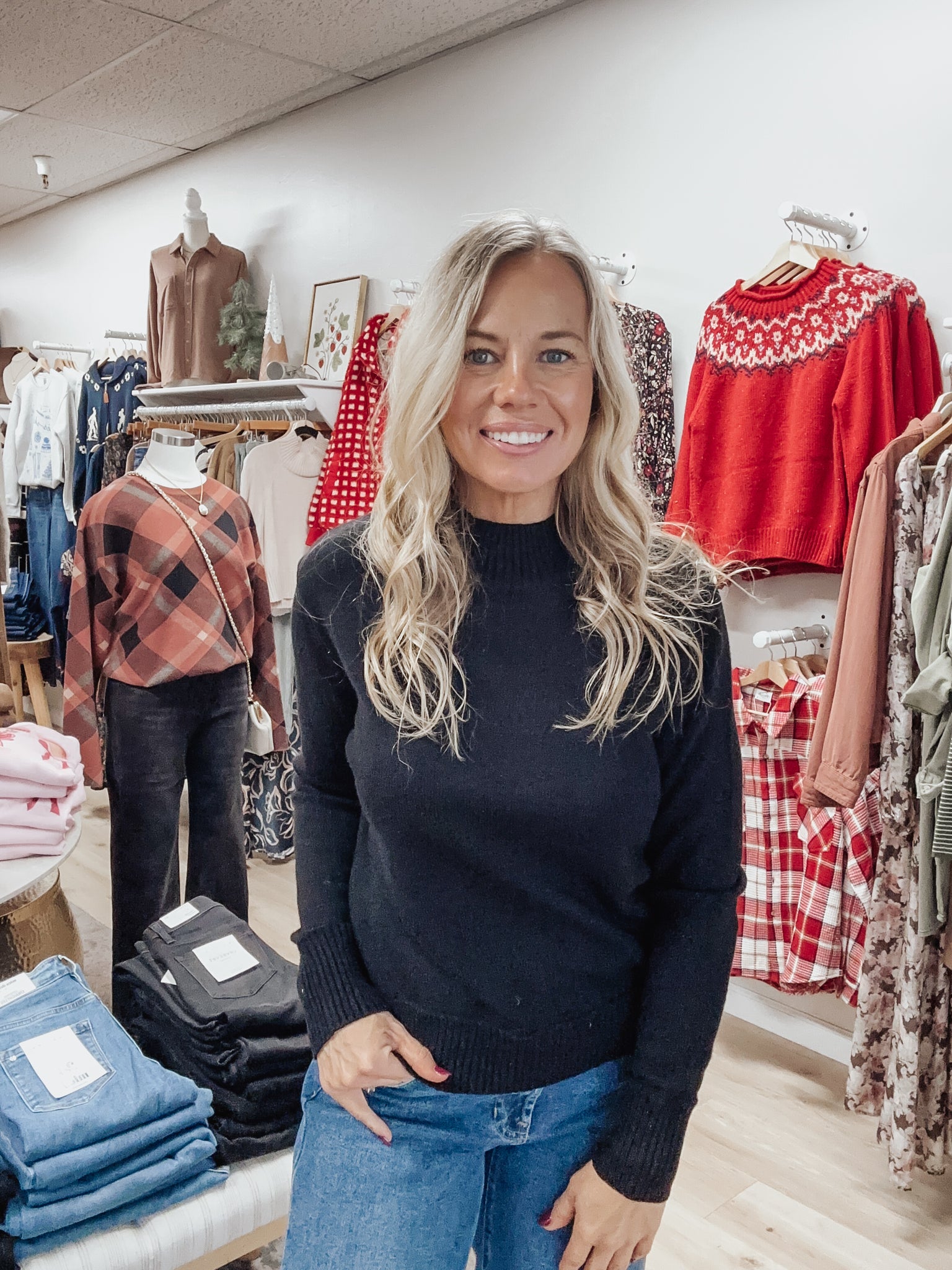 The Midnight Mock Neck Sweater is the elevated basic every winter wardrobe needs. Soft, warm, and perfectly structured, this classic black knit features a mock neckline, ribbed trim, and a timeless silhouette that layers beautifully under coats and shackets or shines on its own.