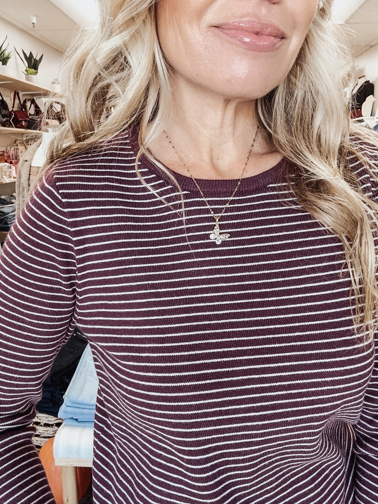 The Dark Plum Stripe Knit is that easy everyday long sleeve you’ll reach for all season. Designed in a soft, medium-weight knit with slim ivory stripes, it drapes comfortably without clinging and offers just the right amount of stretch. The jeweled plum tone pairs beautifully with denim, cords, or layered under a vest or shacket. Model is wearing a medium.