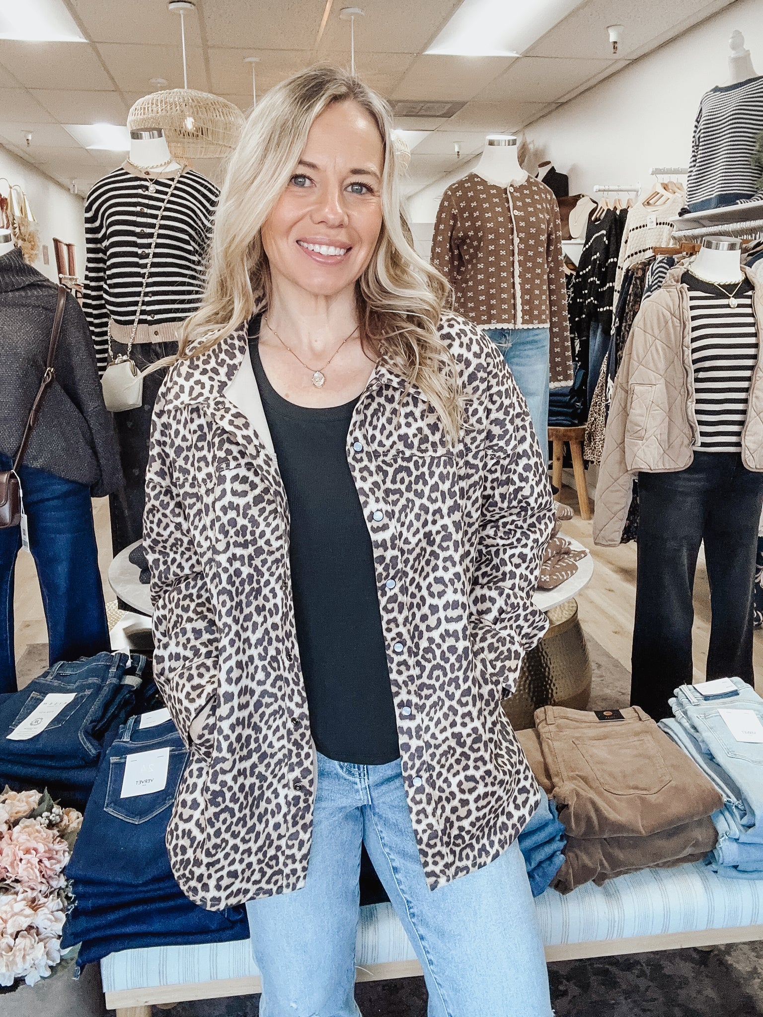 Meet the Rowan Leopard Snap Jacket, your new throw-on layer with personality. This soft, brushed knit has the cozy feel of a sweater with the structure of a lightweight jacket — and the allover leopard print makes every outfit instantly cooler.