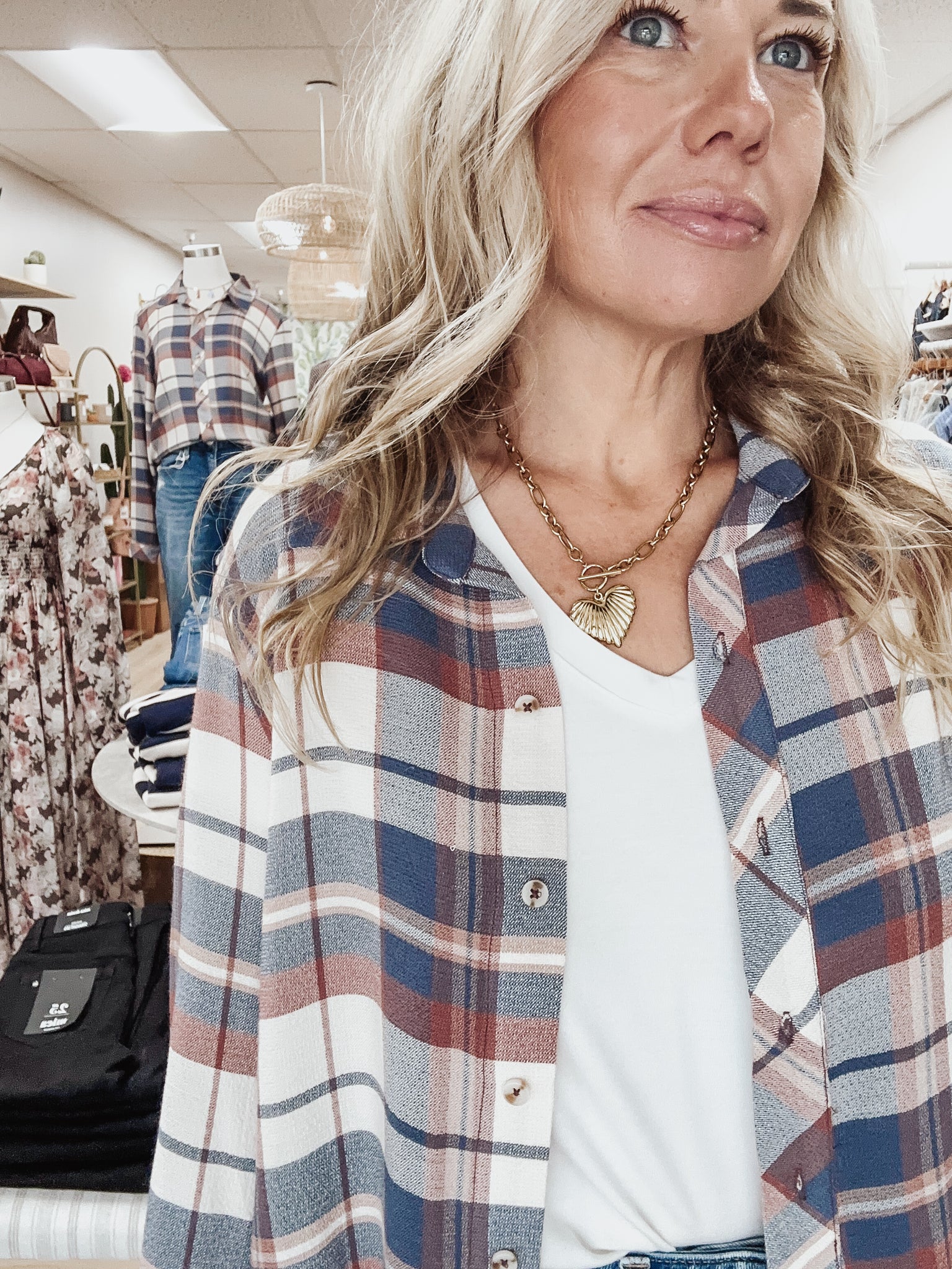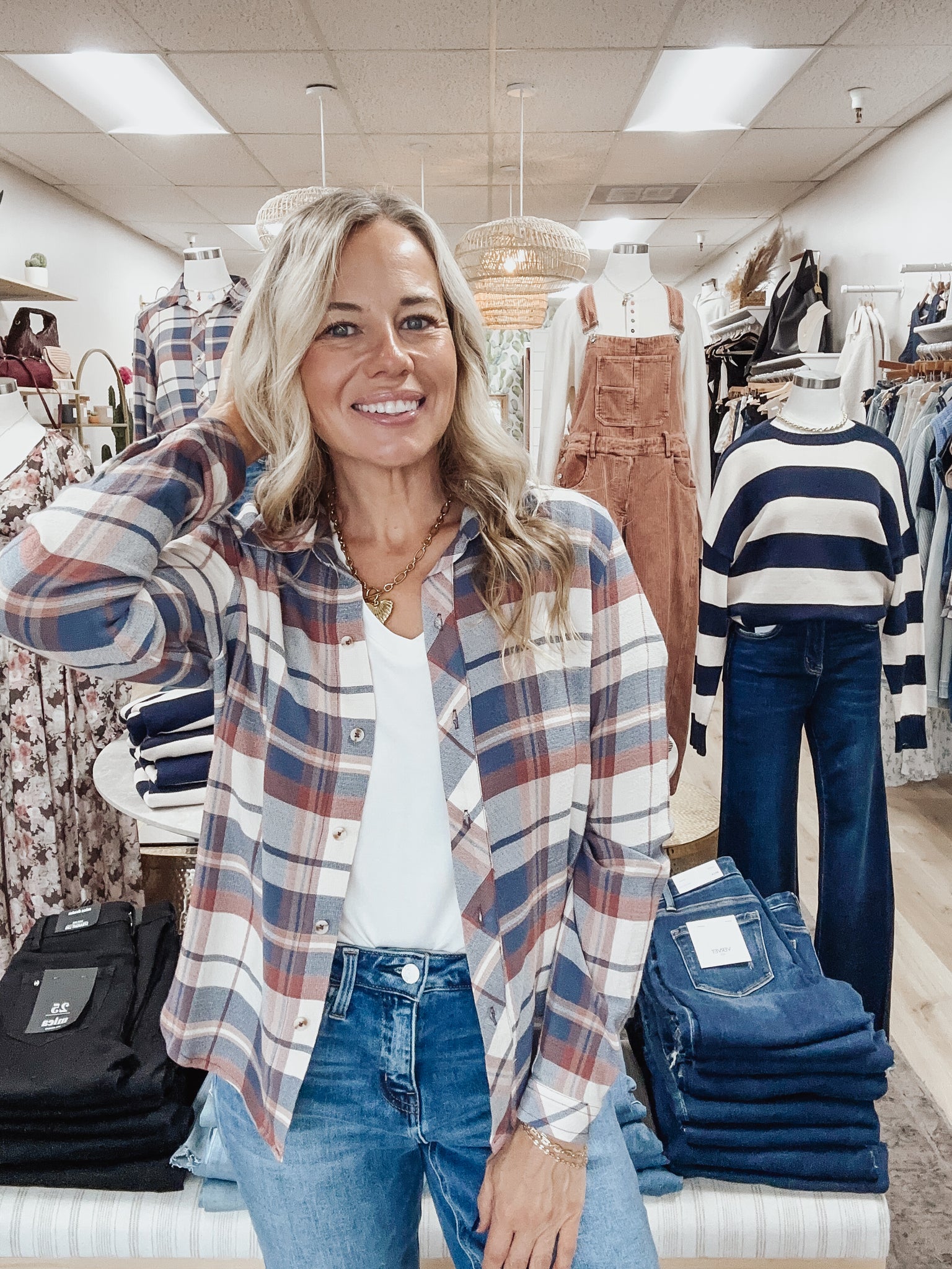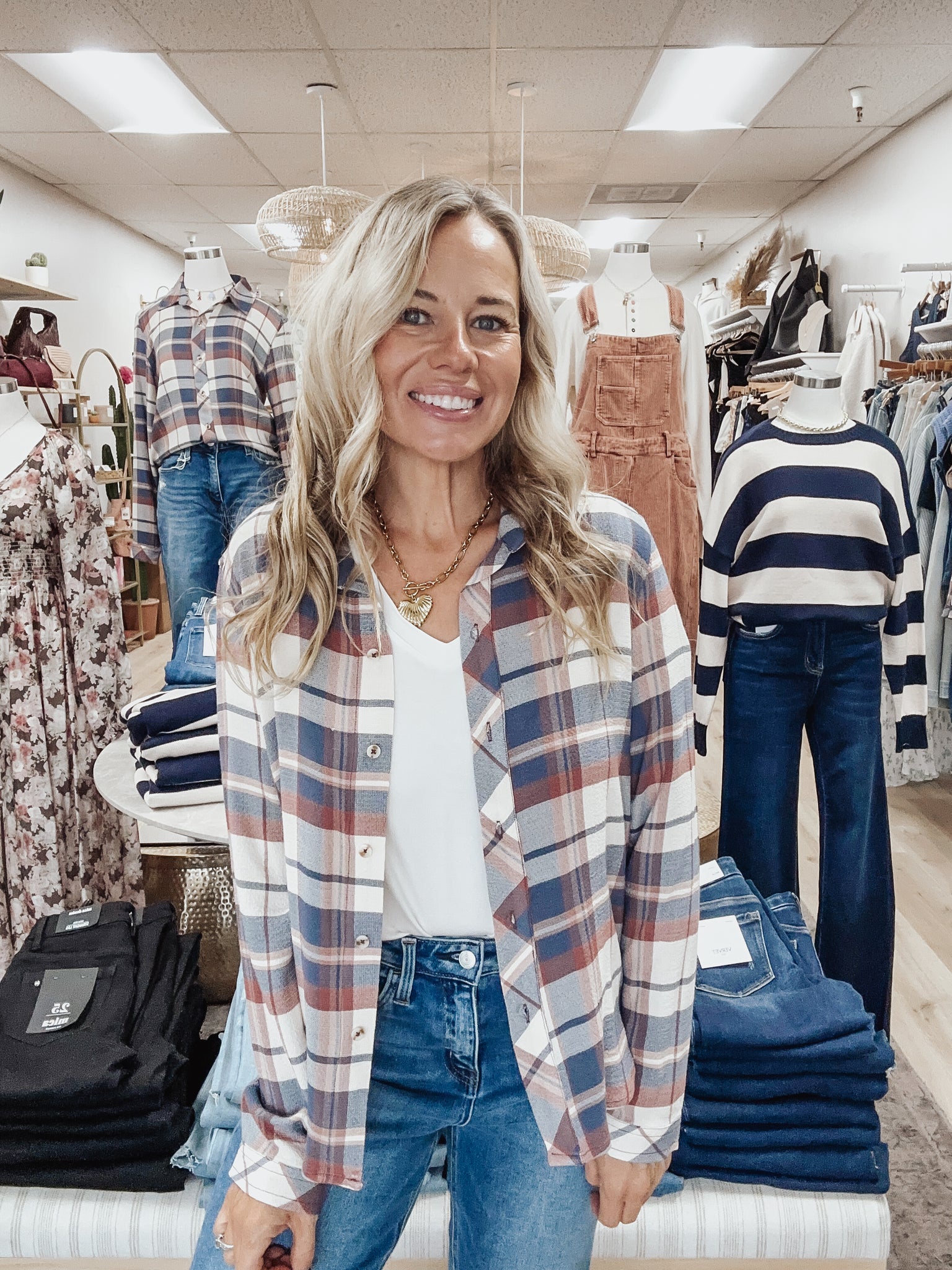 The Rustwood Plaid brings cozy charm in rich shades of rust, navy, and cream. Made with a soft brushed fabric, it’s perfect for layering over a tee, tying around your waist, or buttoning up for a classic look. The relaxed fit makes it versatile for crisp morning walks, casual weekends, or evenings by the fire. This is the kind of plaid that feels timeless yet fresh—effortlessly stylish all season long. Model is wearing a medium.
