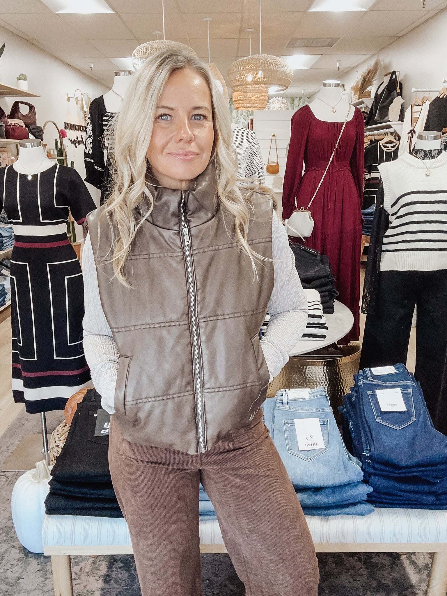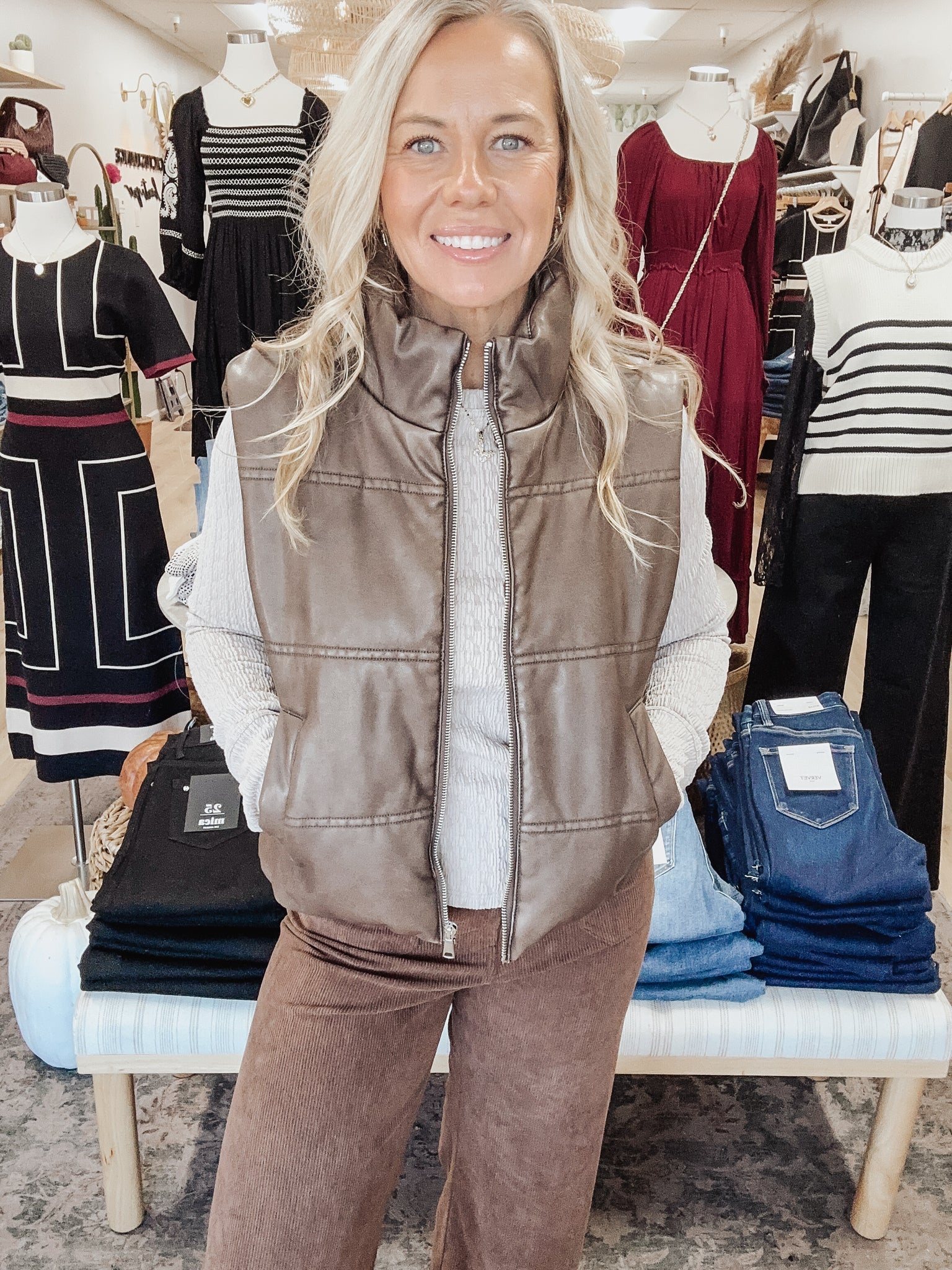 The Saddle Ridge Faux Leather Vest brings an elevated layer to your fall lineup. Crafted in a rich saddle brown with a soft, leather-look finish, it features a high stand collar, zip front, and subtle quilting for a structured yet comfy fit. Side pockets add function, and the length hits just right for pairing over knits, flannels, or basics with denim, cords, or maxi skirts. A chic alternative to a puffer without the bulk. Model is wearing a medium.